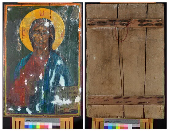 In any case, however, the identification and documentation of the materials and state of preservation of the overpaintings and the underlying paint(s) is essential for both the sound assessment of the artifact and the establishment of a proper conservation plan. Analytical techniques allow for the in-depth investigation of paintings, while novel imaging techniques offer the potentiality of revealing hidden layers through a completely non-invasive approach [8,16,17,18,19]. In the current work, authors investigate a particularly interesting, heavily overpainted icon (i.e., religious panel painting) of Christ Pantokrator (ΠΑΝΤΟΚΡΑΤΩΡ: the omnipotent lord of the universe/the almighty ruler) that measures 65.0 × 45.0 × 3.1 cm3 and originates from a private collection in Skyros Island, Aegean Sea (Figure 1).