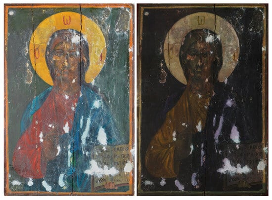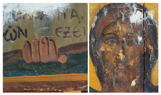 In the context of Eastern Orthodox Christian religious practices, portable panel paintings (henceforth icons) are considered sacred and functional objects even if they have undergone severe damage. As a result, rather than replacing them, church stakeholders often chose to “repair” them by—among other types of interventions, see [3]—overpainting the original in order to preserve the liturgical role of the icon. In this framework, overpainting can range from minimal local interventions such as those on the figures in Michael Damaskinos’s “Last Supper” icon [4] and local overpaintings and retouchings on a Cypriot Virgin Mary icon [5], to complete covering of the originally synthesis with a replication or even a new theme like the notable 16th century Saint Athanasios [6,7] and other icons [8]. Far more rare is the case of overpainting a non-religious theme over an existing icon, and there are only few pertinent examples in the current literature [9]. Of course, there did exist instances of extreme decay where interventions would not work anymore, and it is worth noting that, in these cases, the icons should be treated like holy relics and be buried “in a pure place” [10].