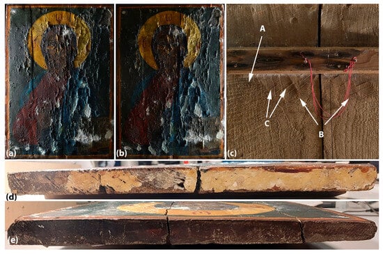 (a,b) The icon under raking light, from the left and right side respectively. (c) Detail of the rear of the icon, raking light, tool mark: A: saw kerf likely created by a two men’s frame saw; B: hollowed facets likely created by a curved adze; C: rigged lines of wood in each facet are attributed to the dented cutting edge of the adze. (d) Lower transverse panel side showing slow growth tree rings; plank originating from a position close to the pith; the off-white substance corresponds to priming material/gesso (presumably pertaining to the later interventions). (e) Top transverse side, with uneven saw cutting marks.