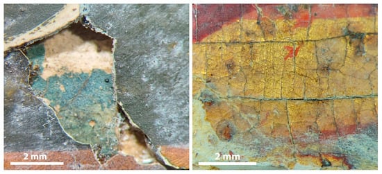 Extremely important was also the meticulous stereoscopic probing of the painting, as it revealed the presence of subject/older paint layers in various areas where the upper paint layers had been detached and lost (Figure 4 Left). Additionally, in the left part of Jesus’ halo, remnants of gilding, red lettering and a cracked, presumably old varnish were spotted too (Figure 4 Right).