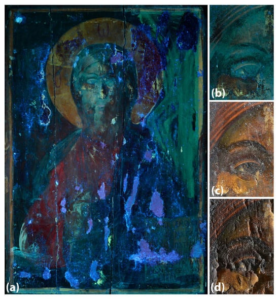(a) The UVL of the recto of the icon. (b–d) Details of Jesus’ face left part in UVL, VIS symmetrical and VIS raking, respectively.