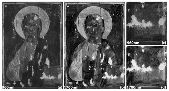 In particular, in the present research, two different cameras were used, both pertaining to the infrared region. Regarding the hyperspectral camera, the image with the best contrast was the one at 960 nm (Figure 6). Being monochromatic, it is not influenced by other radiations; therefore, the information obtained is clearer and refers to deeper layers than those seen by the naked eye. Compared to the visible image, the folds of the mantle and inner garment are recorded in full detail, which enables useful information about the artist’s technique to be obtained. Comparison between the left and right hand at 960 nm is fundamental to proving that these areas have been painted by two different people. The InGaAs camera (IRR) (Figure 6) provided even more information than the image at 960 nm. The IRR image presents high sharpness and contrast and refers to even greater depth than the hyperspectral one. As a result, the area of the face is more clearly depicted and the boundaries between the two artists are more prominent. Even though the 960 nm image showed traces of letters emerging underneath the visible ones on the Gospel, they still are not well shaped and illegible. On the contrary, the IRR image presents in full detail the writing that was later covered and reveals that the original lettering is not preserved on the lower part of the Gospel. Furthermore, the plaits and folds are sharper and better visualized and the artist’s brushstrokes clearly distinguishable.