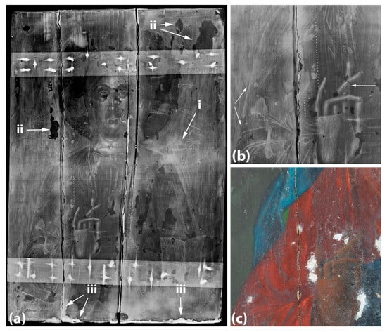 X-ray radiography (XRR) revealed important information about the internal structure of the artifact. In particular, XRR highlighted the numerous metallic nails that were used to fasten the two cross bars on the panel and revealed diffusion of the corresponding corrosion products within the wood (Figure 8a). Incised underdrawing is documented in several elements like the blessing hand, the halo, the vestment, and the book, thus revealing notable differences between the original drawing (incised lines) and the visible composition. Note that these very thin lines show increased X-ray absorption in comparison to their surroundings, and this might well suggest that the incisions had been filled by paint(s) containing heavy elements [11]. Additionally, the employment of pigments containing heavy elements in the original painting allowed for the detection of several currently invisible details of the original painting, like the lettering on the right part of the icons’ campus which reads “ΚΡΆΤΩΡ” (pertaining to the iconographic type of the original depiction/“Pantokrator”) (Figure 8a), and the particularly skillful rendering of Jesus’ face and vestments (Figure 8b,c). Also, XRR allowed for the precise mapping of the margins of the areas of original gesso losses, since the white filler does not absorb intensively the X-rays; therefore, the latter areas appear as rather dark spots on the radiograph (Figure 8a, arrows “ii”). It is worth noting, however, that in a couple of areas that have undergone mechanical stresses (the central crack and the lower part of the panel), the radiograph revealed the presence of an intensively absorbing material instead (Figure 8a, arrows “iii”), which clearly indicates that the filling of the original gesso losses was performed with at least two distinct materials and, hence, in two steps.