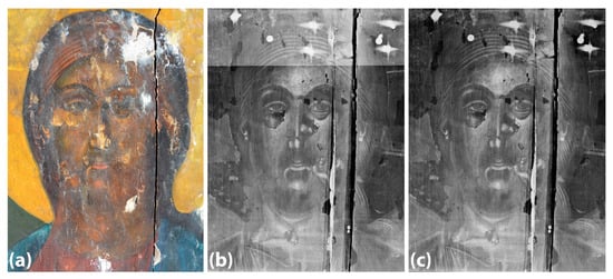 The employed imaging system included a Goldeye P-008 SWIR Cool camera (Allied Vision, Stadtroda, Germany) with an InGaAs sensor (900–1700 nm), and KOWA CCTV lenses (16 mm and 50 mm) (Kowa Optimed Deutschland GmbH, Dusseldorf, Germany). Illumination was provided by two tungsten lamps angled at 45° relative to the object’s surface. Due to the camera sensor’s rather small resolution, a virtual grid was applied to the icon for alignment and collection of multiple successive shots, greyscale images were captured across the surface [21,27,35,36]. Selected details of particular interest—especially various overpainted areas—were further documented.