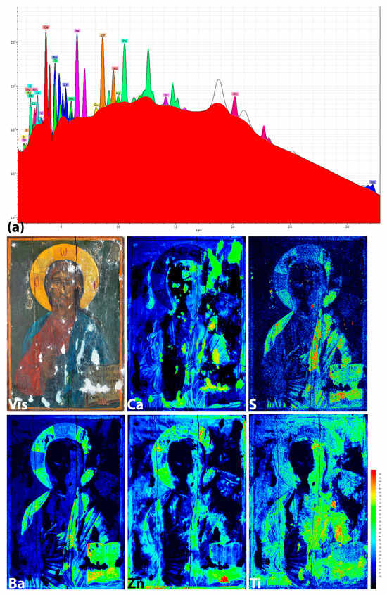 The MA-XRF sum spectrum (a), followed by a photograph of the icon (Vis) and the distribution maps (MA-XRF) of the chemical elements calcium, sulfur, barium, zinc, and titanium.