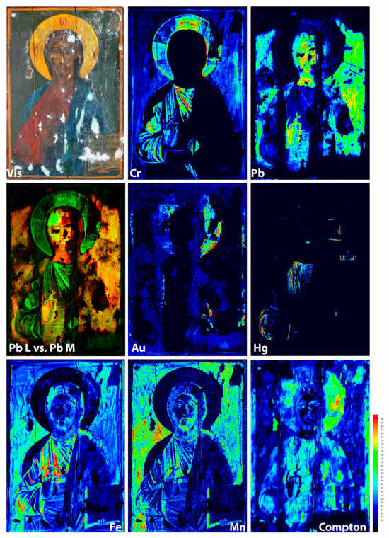 The distribution maps of specific elements and, in particular, lead (Pb), mercury (Hg), and gold (Au) are evidently relevant almost exclusively to the oldest, original painting. In particular, the distribution of Pd highlights in great detail the areas where the original painting is still preserved. In addition, lead white was practically omnipresent in the painting of post-Byzantine icons, as it was extensively used both as a means to render highlights and as a common ingredient of the majority of the corresponding paint layers [7,11,32,53,54]. Additionally, one shall highlight the serendipity that the overpainting layers contain almost no lead; therefore, this element can be safely assigned almost exclusively to the original painting. On this basis, the distribution of lead highlights very clearly the areas of the original painting losses, which are primarily located on the bottom and upper part of the panel, as well as on the edges of the two vertical cracks that run parallel to the height of the panel (Figure 11).