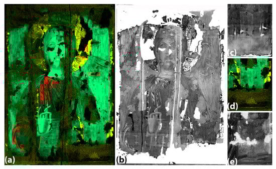 The multimodal analytical protocol employed for the examination of the Jesus Christ Pantokrator icon led to the thorough investigation of the painting’s stratigraphy, revealing that the currently visible paint layers correspond primarily to recent overpainting, which was executed using modern (i.e., post-19th c.) pigments. Additionally, the employment of various analytical techniques that allow for the visualization of subsurface/hidden layers revealed that a considerable part of the original painting remains rather well preserved below the layers of overpainting. In order to better understand and assess the technical and stylistic characteristics of the original panel, an attempt was made to combine data. A first relevant example is the combination of the MA-XRF elemental distribution maps of lead (Pb), mercury (Hg), and gold (Au), which outlines graphically the original painting (Figure 12a). In fact, the elements Hg and Au are detected exclusively due to the original painting’s components, while Pb is primarily detected in the original painting as well (Figure 12a). However, minor Pb is detected in specific parts of the overpainting too (e.g., halo, see Section 3.5 and Figure 11); therefore, this mapping of the original painting shall be critically treated. Another attempt to reveal the preserved original painting was made through the digital superimposition [20] of MA-XRF, XRR and IRR images (Figure 12b). Once more, the outcome suggests that the original painting is preserved to a considerable extent, and the areas of its loss are quite precisely defined. Moreover, the latter composite image highlights the complementarity of the employed techniques. Indeed, a characteristic example that underscores the need to use multiple analytical techniques is the area of the Gospel. X-ray radiography (Figure 12c) reveals a book outline that deviates substantially from that observed macroscopically and a faint Epsilon initial, while MA-XRF (Figure 12d) reveals the elemental composition of this area and proves that the initial Epsilon letter was rendered in vermilion. However, the original text, written in a far more elaborate manner than the modern one, is visible only via IR reflectography, probably because it was rendered in carbon black which is transparent in X-rays (Figure 12e).