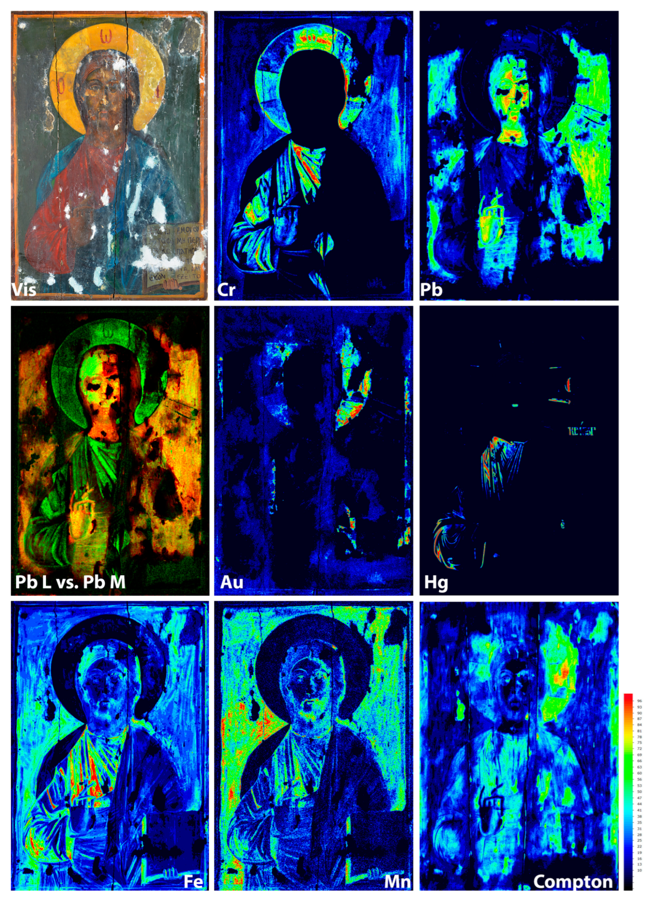- Mastrotheodoros, G.P.; Asvestas, A.; Gerodimos, T.; Anagnostopoulos, D.F. Revealing the Materials, Painting Techniques, and State of Preservation of a Heavily Altered Early 19th Century Greek Icon through MA-XRF. Heritage 2023, 6, 1903–1920. [Google Scholar] [CrossRef]
