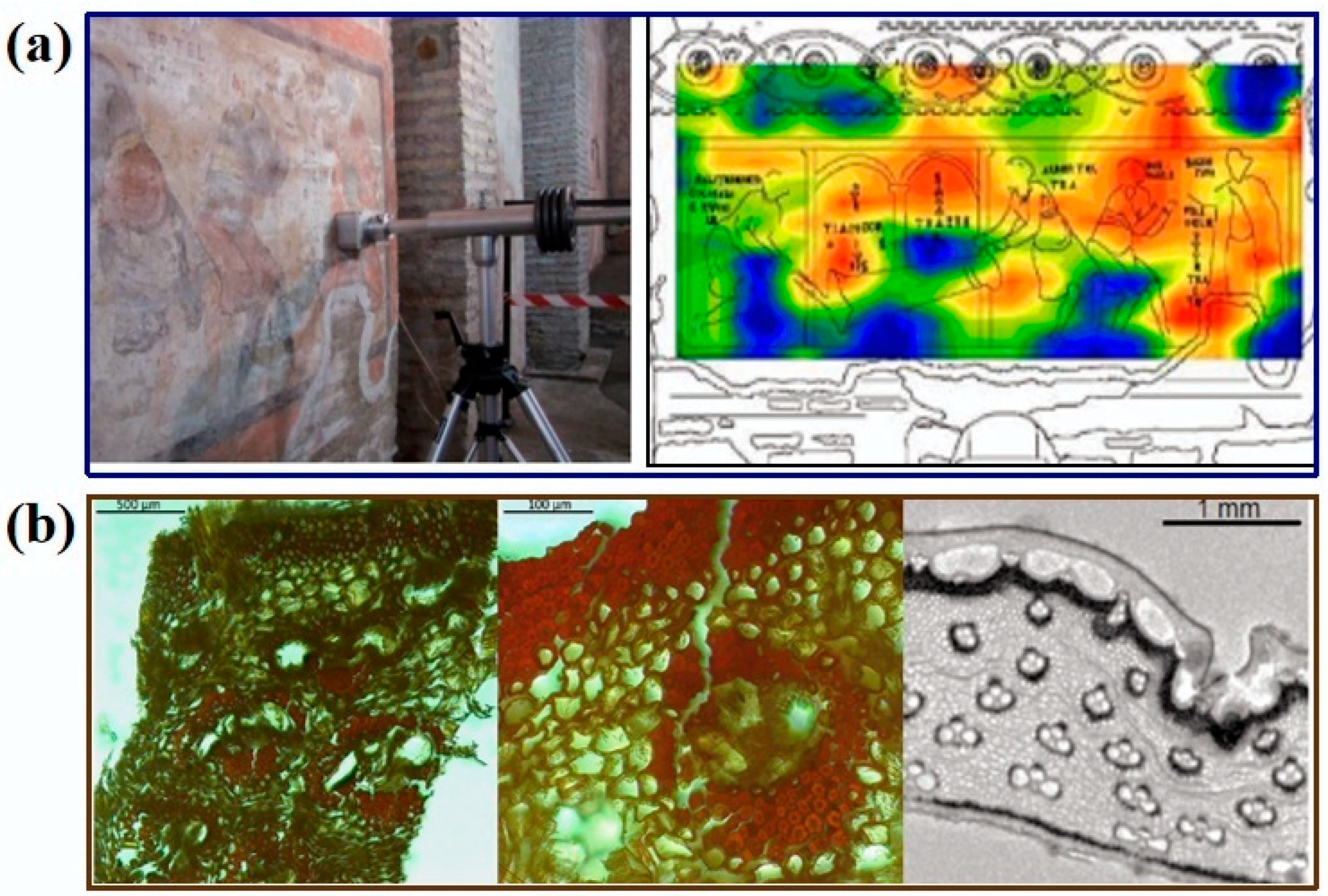 - Tortora, M.; Sfarra, S.; Chiarini, M.; Daniele, V.; Taglieri, G.; Cerichelli, G. Non-destructive and micro-invasive testing techniques for characterizing materials, structures and restoration problems in mural paintings. Appl. Surf. Sci. 2016, 387, 971–985. [Google Scholar] [CrossRef]