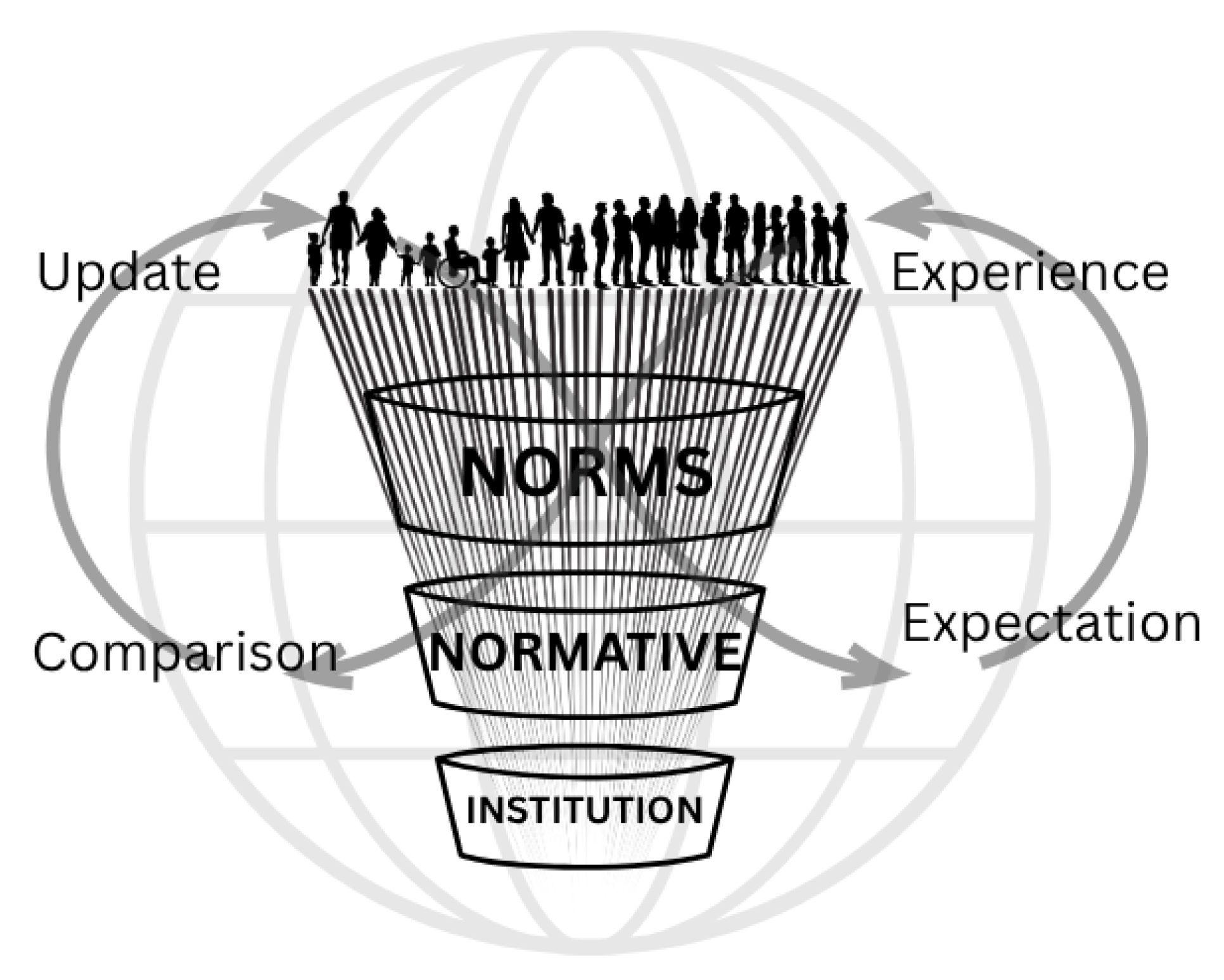 Normativity coordinates the collective coherence of the population’s information through mutual expectations instead of authority or enforcement. It is the expectation through which others in the community are able to evaluate the propriety of an individual’s beliefs or actions. In effect, it reconciles individual information landscapes (derived from personal experiences) with the collective landscape. This is the second-order structural moment of social information (i.e., its “variance”), representing the permissible diversity within the community. It establishes the range of expectations within the community that can be reasonably anticipated by its members and what is considered “normal” for the group.