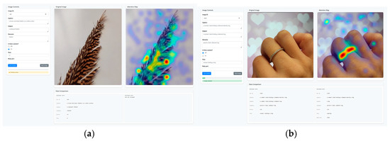 Shiny application interfaces showing different object recognition. (a) Pre-review interface displaying a pheasant feather with its attention heatmap highlighting the structure. (b) Post-review interface showing a diamond ring on a hand. Both examples showcase the interface components: manual annotation controls, original images, and corresponding attention heatmaps. The data comparison panel displays the original AI-generated descriptions alongside the human-reviewed data, illustrating the validation workflow.