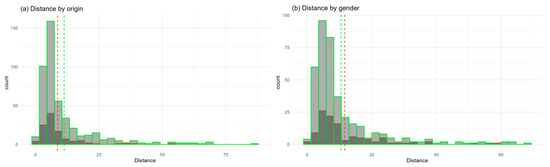 (a) The distribution of the distances between colors between the Instagram and Personas y Patrimonios communities; we observe that the distance between the means of the two distributions shows significant differences. In (b), we can observe the distribution of the distance between colors as a function of gender.