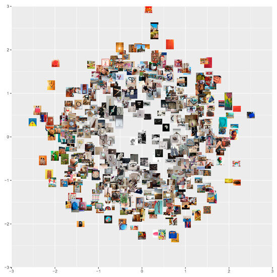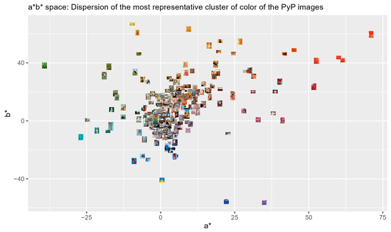 Another interesting aspect of using the CIE-Lab color model is that it allows us to place the images within the plane formed by a* and b* and, consequently, to check how the images are distributed in the plane according to their most representative color (Figure 3).