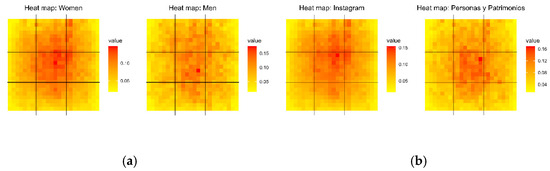 To conclude our analysis, we found statistically significant differences between the heat maps for Personas y Patrimonios and Instagram (t = −2.576, df = 1149.5, p = 0.010, 95% CI [−0.008, −0.001]). However, the effect size was small (Cohen’s d = 0.147, 95% CI [0.031, 0.262]), with Instagram users showing slightly higher attention values overall, particularly in the right third of the heat map. This finding, along with our observations on content preferences and color patterns, points to subtle but consistent patterns in digital heritage communication across platforms.