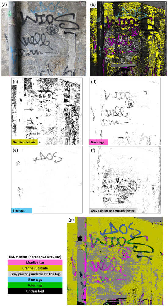 This paper presents the results of the historical and artistic documentation and the conservation assessment of a tag by Muelle, a pioneering Spanish graffiti artist, in the city of Vigo (Galicia, Spain). Attribution of the tag is primarily based on evidence of the artist’s presence in the city in the late 1980s, such as by different graffiti elements in the form of tags. To increase the understanding of the technique and materials used, the tag and its substrate were documented and examined by digital photography and hyperspectral imaging. Microsamples of the tag and substrate were analyzed by X-ray diffraction, Fourier transform infrared spectroscopy, optical microscopy, and scanning electron microscopy to characterize the materials and assess the tag’s state of conservation. This work enabled us to document the tag within the context of its creation and to establish hypotheses regarding the intention behind it. We confirmed that the tag has been weathered by degradation processes that typically affect contemporary urban art, with scaling caused by deterioration of the substrate being the most important type of alteration. The results of this multidisciplinary study will be key to identifying the most appropriate intervention measures to ensure the tag’s conservation and the transmission of its legacy. Full article