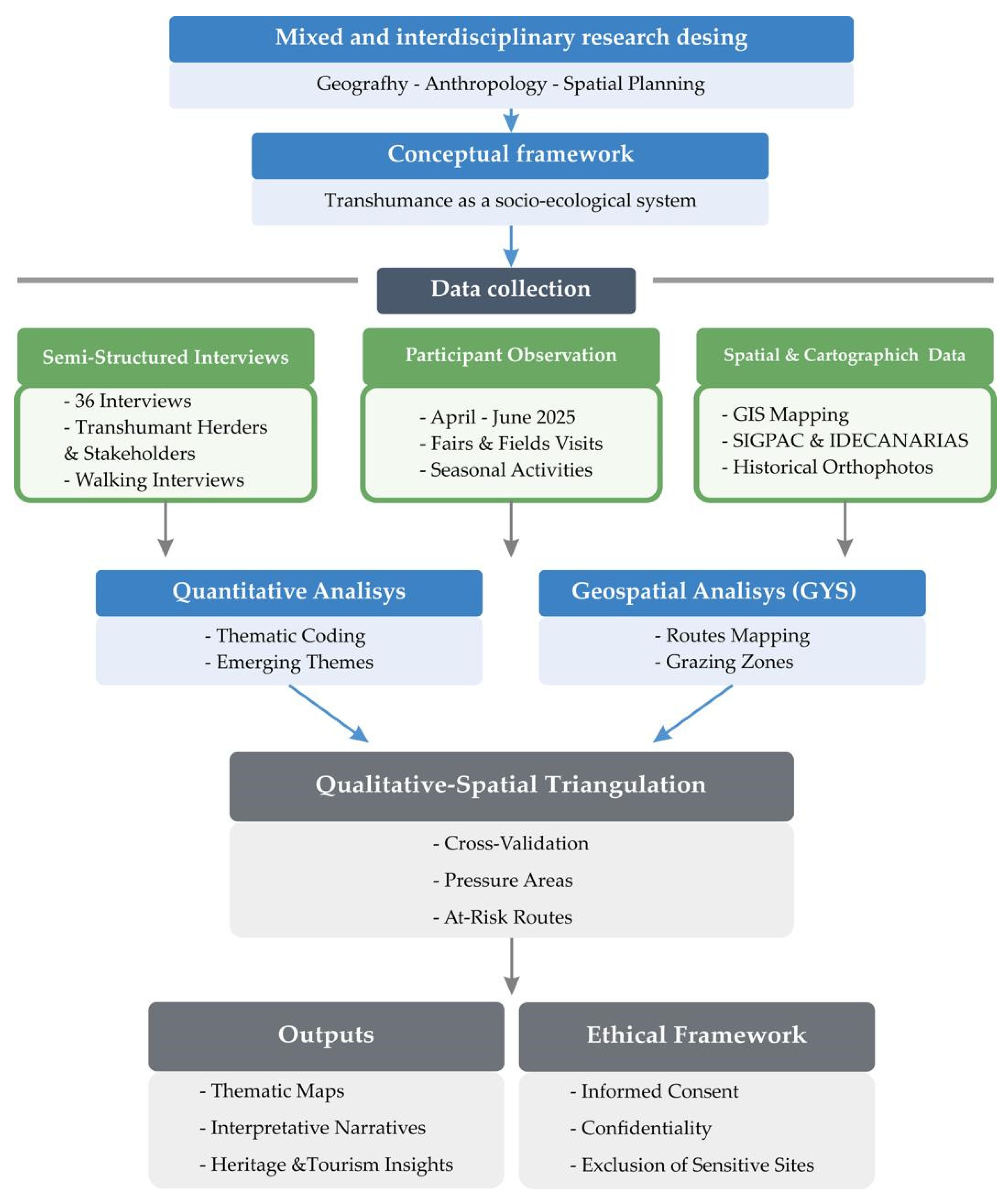 The study of contemporary transhumance in Gran Canaria was conducted through a mixed and interdisciplinary design. The approach integrates qualitative research, ethnographic fieldwork and spatial analysis to understand a socio-ecological system shaped by pastoral mobility, landscape configuration, family practices and traditional knowledge. Transhumance is conceived as a dynamic territorial practice, requiring a methodological framework capable of capturing both narrative depth and spatial materiality [