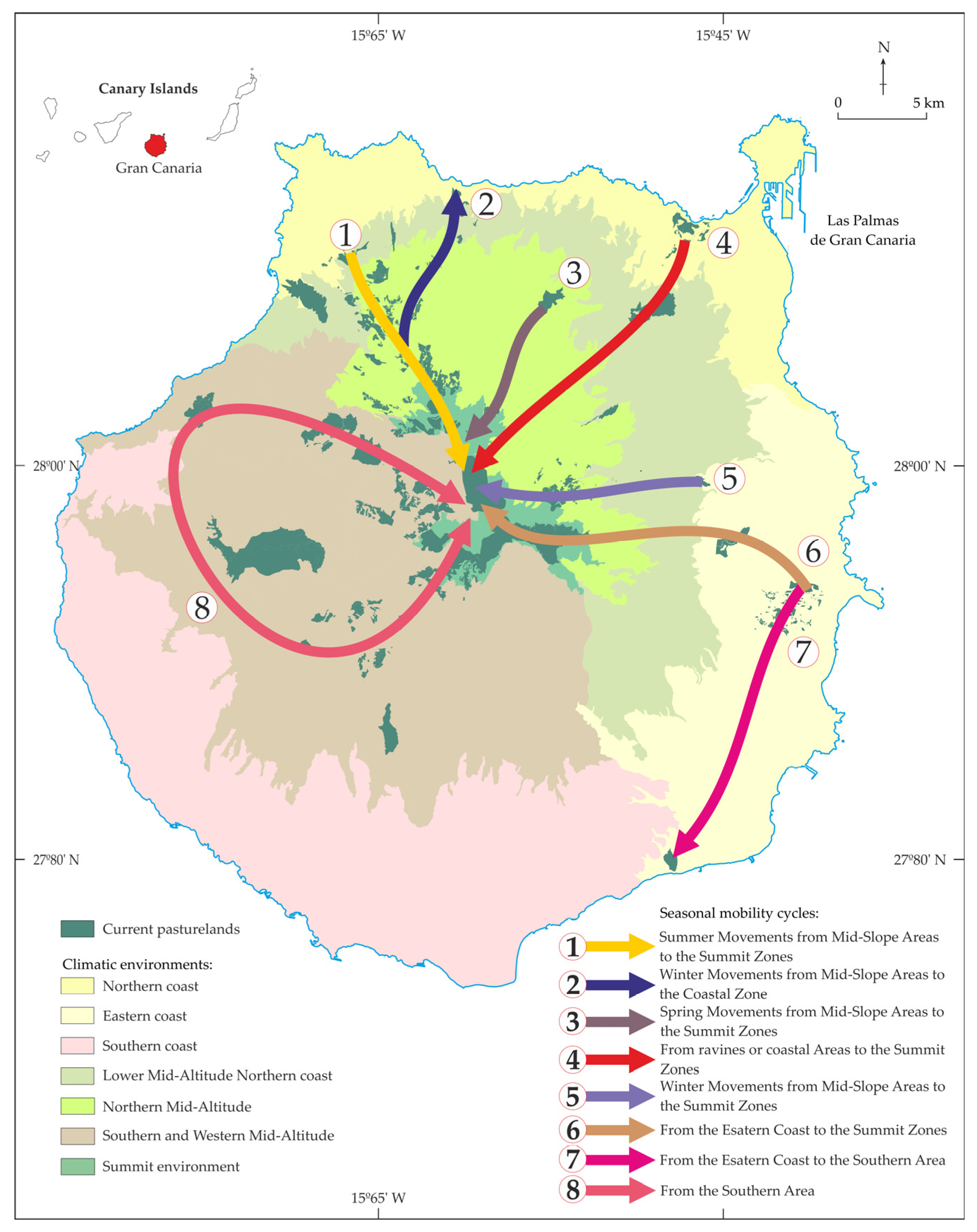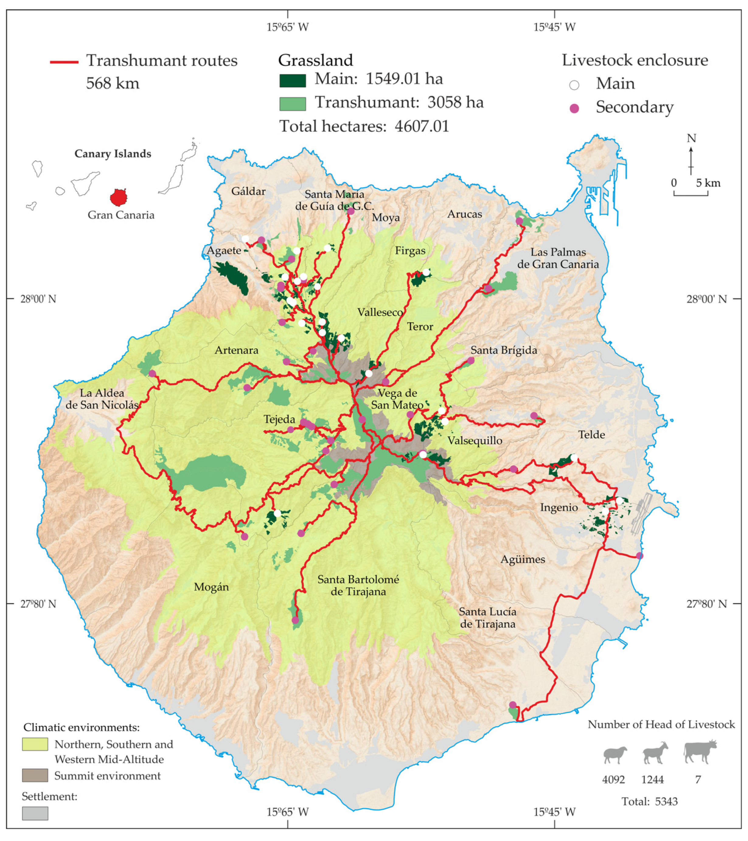 Previous research on Gran Canaria has documented transhumance from historical and descriptive perspectives, analysing its role in territorial articulation and cultural landscape formation and providing a first systematic mapping of routes, shepherds and pastoral infrastructures on the island (see [
