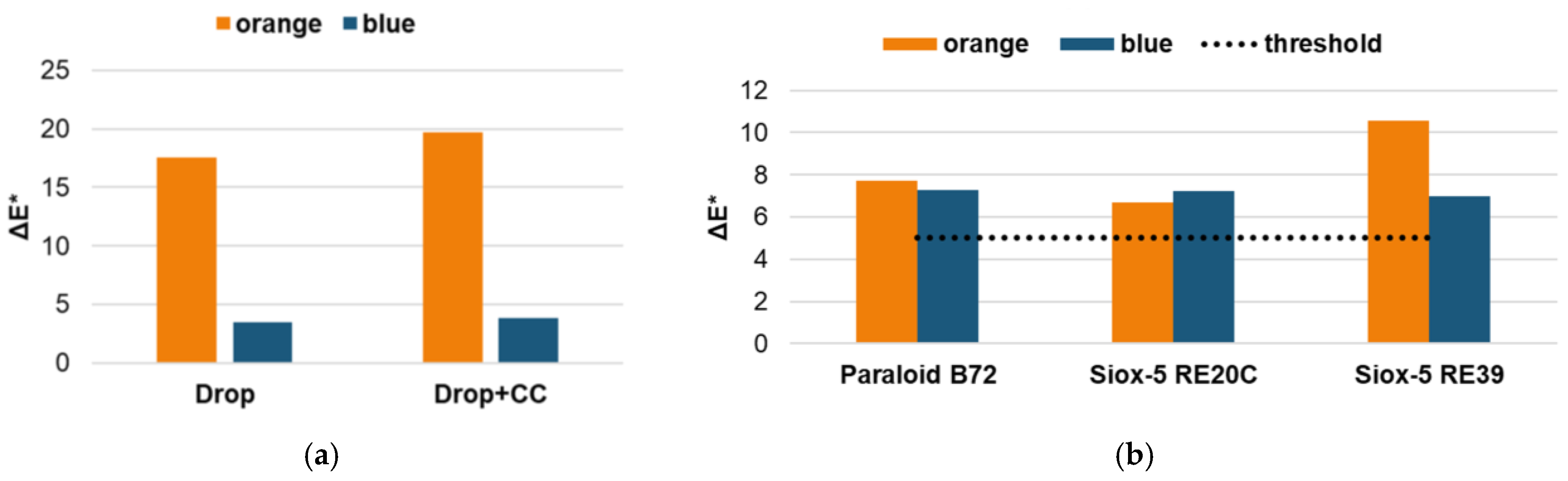 - Pintus, V.; Wei, S.; Schreiner, M. UV Ageing Studies: Evaluation of Lightfastness Declarations of Commercial Acrylic Paints. Anal. Bioanal. Chem. 2012, 402, 1567–1584. [Google Scholar] [CrossRef]