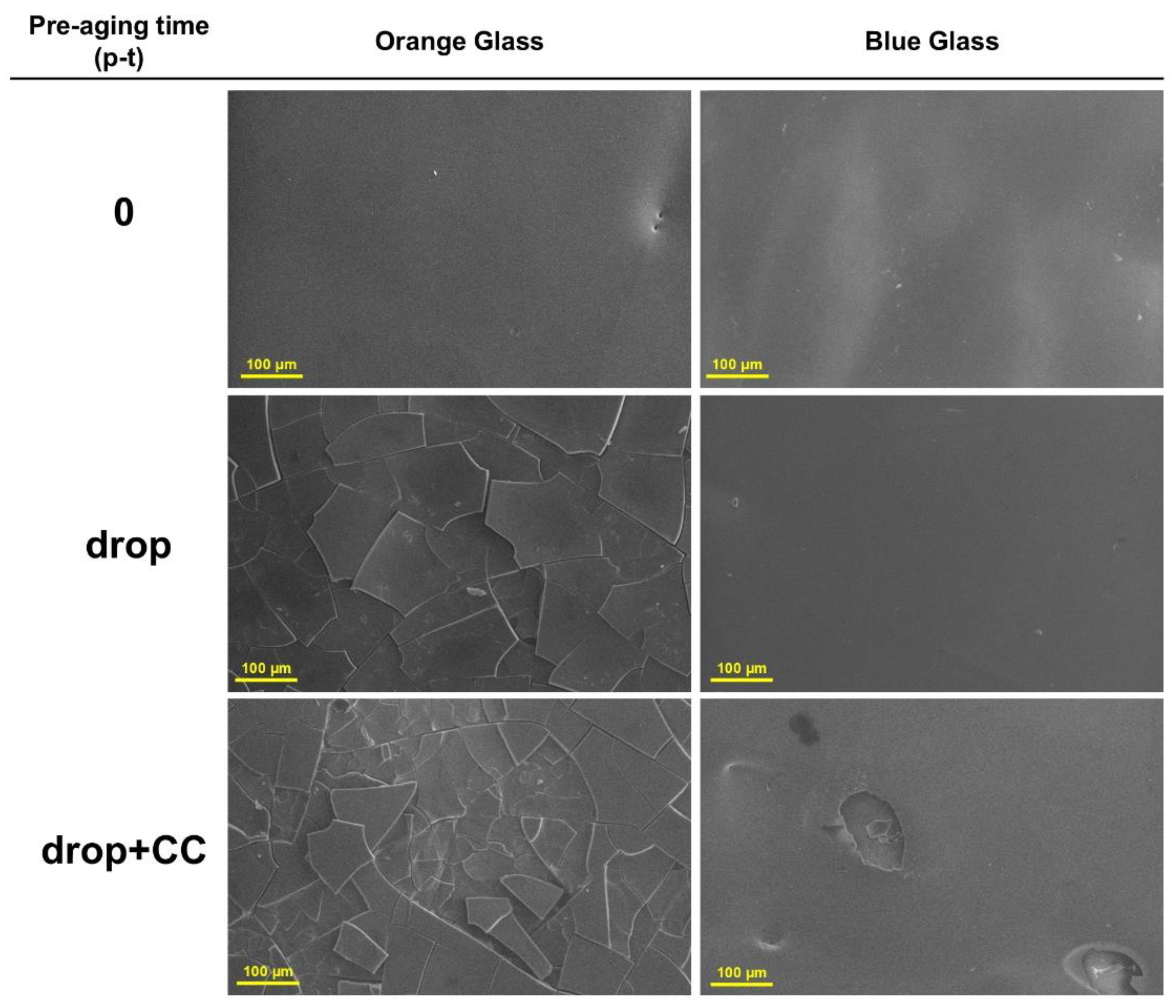 | orange glass | pre-aging time (p-t) | C | O | Na | Al | Si | S | Cl | K | F | Zn | Cd | |||||||||||