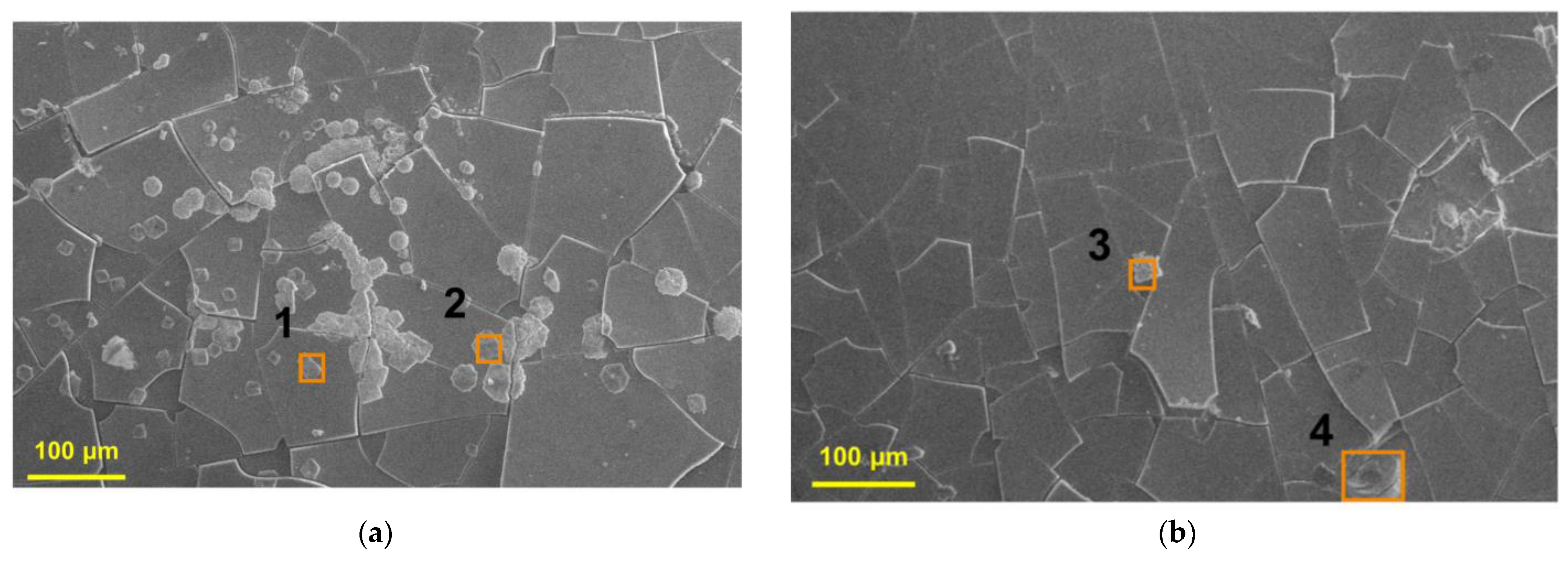 - Alloteau, F.; Majérus, O.; Biron, I.; Lehuédé, P.; Caurant, D.; Charpentier, T.; Seyeux, A. Temperature-Dependent Mechanisms of the Atmospheric Alteration of a Mixed-Alkali Lime Silicate Glass. Corros. Sci. 2019, 159, 108129. [Google Scholar] [CrossRef]