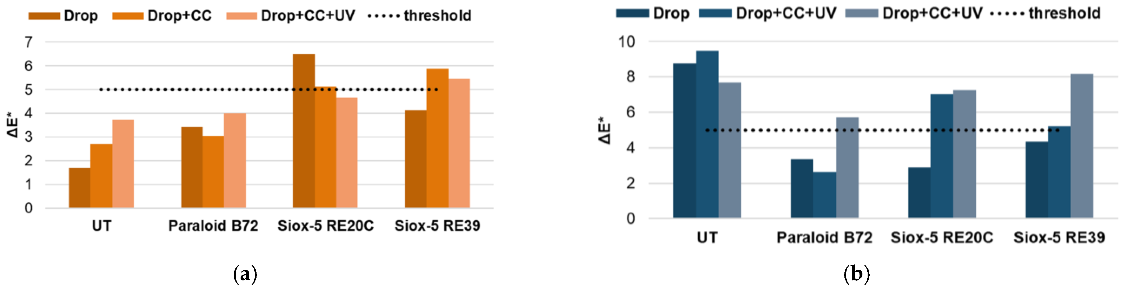 - Oancea, A.V.; Bodi, G.; Cernescu, A.; Spiridon, I.; Nicolescu, A.; Drobota, M.; Cotofana, C.; Simionescu, B.C.; Olaru, M. Protective Coatings for Ceramic Artefacts Exposed to UV Ageing. npj Mater. Degrad. 2023, 7, 21. [Google Scholar] [CrossRef]