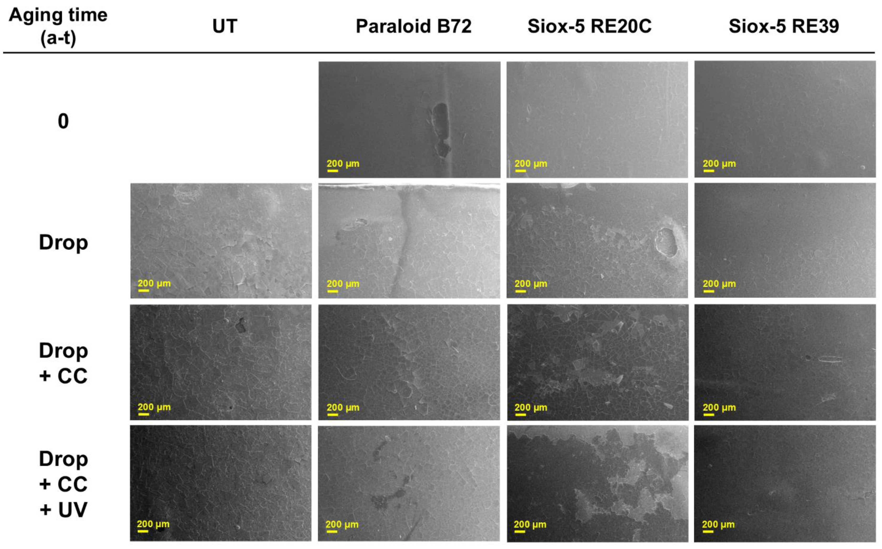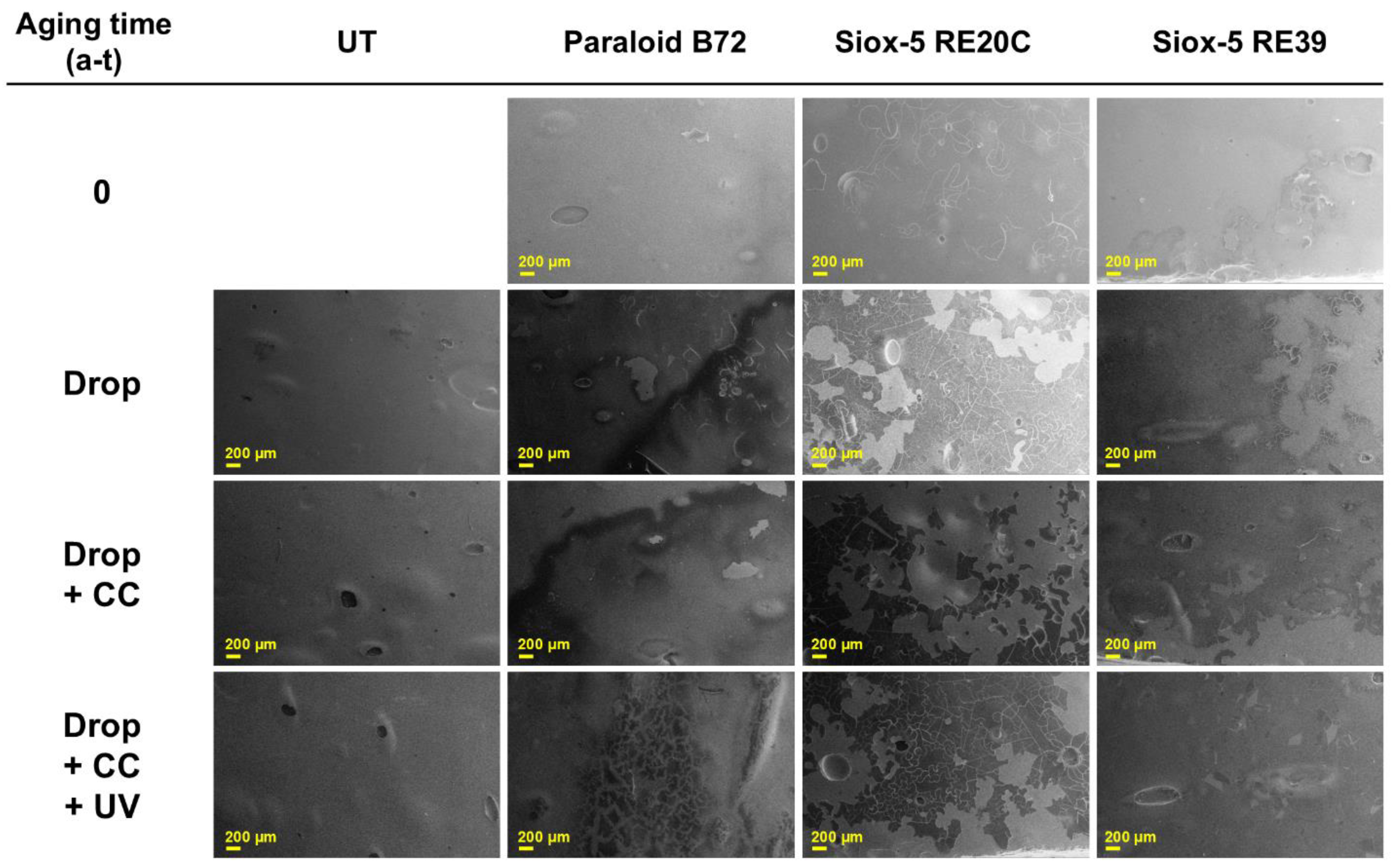 - Zhao, X.; Li, X.; Zhang, S.; Niu, Q.; Li, Z.; Xue, C. Investigation of Whitening Mechanism on Cultural Relic Surfaces Treated with Paraloid B72. Coatings 2024, 14, 1240. [Google Scholar] [CrossRef]