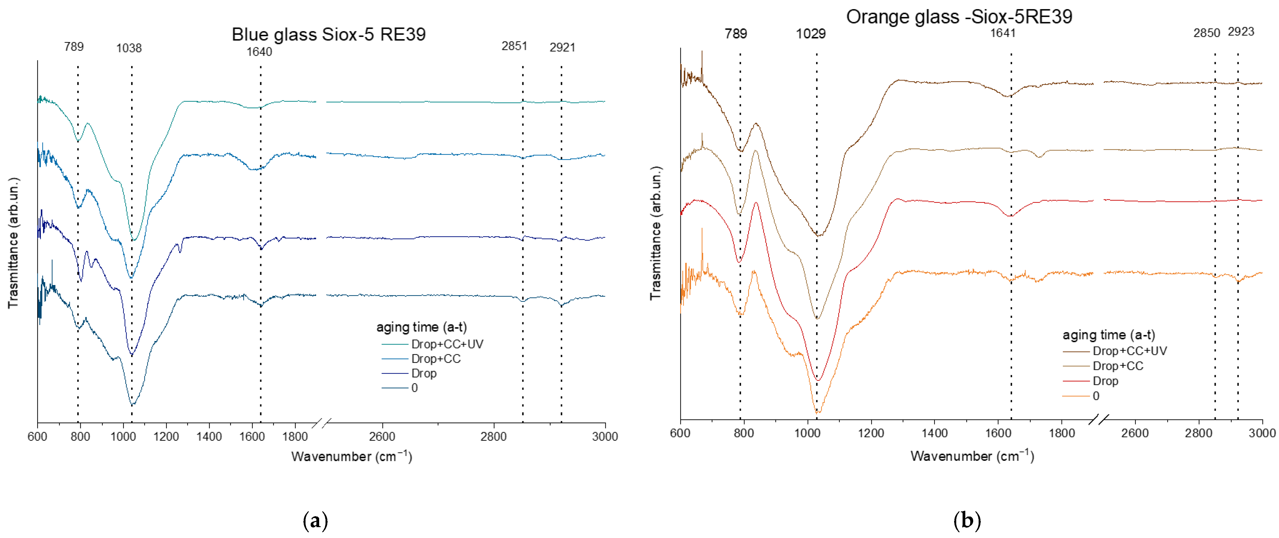 - Robinet, L.; Hall, C.; Eremin, K.; Fearn, S.; Tate, J. Alteration of Soda Silicate Glasses by Organic Pollutants in Museums: Mechanisms and Kinetics. J. Non-Cryst. Solids 2009, 355, 1479–1488. [Google Scholar] [CrossRef]
