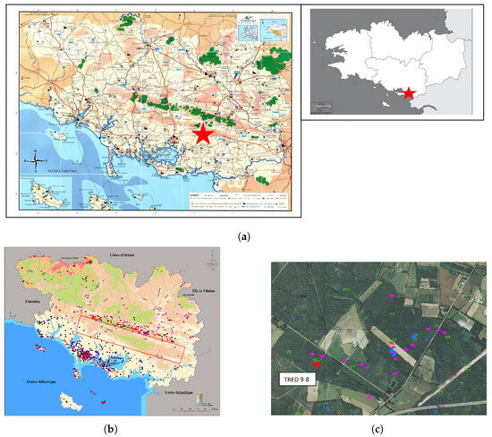 Location and distribution of remains at the Coëby site [3]. (a) Geographic location map of the Coëby necropolis (Trédion municipality, Morbihan, France), generated using geographic information system (GIS) data from the French National Institute of Geographic and Forest Information (IGN). (b) Distribution map of megalithic remains across the Landes de Lanyaux massif, produced by compiling systematic survey data and integrated into a GIS. (c) Plan of the distribution of structures within the Coëby necropolis (purple) and location of the archaeological operation (red), created from topographic surveys.