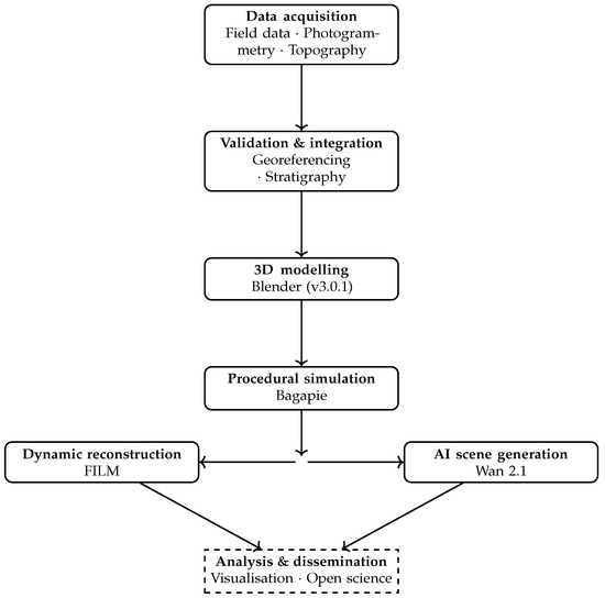 Synthetic diagram of the methodological processing pipeline, from data acquisition to visualization. The workflow integrates field data, photogrammetry, and topography; their georeferencing and stratigraphic validation; explicit 3D modeling in Blender; procedural block simulation using the Bagapie extension; dynamic video interpolation with the FILM model; narrative scene generation via the Wan AI model; and finally, scientific analysis and mediation phases.