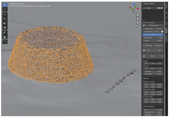 The simulation of lithic block distribution was performed in Blender using the open-source extension Bagapie [31]. The procedural simulation of lithic block distribution is conceived as a constrained exploratory tool rather than a predictive reconstruction. Its objective is not to reproduce a single “true” construction state, but to explore a space of volumetrically and architecturally plausible solutions compatible with the archaeological record. Consequently, the robustness of the method does not rely on a unique parameter setting, but on the convergence of global structural outcomes under a range of archaeologically plausible parameters. Developed for the procedural generation of complex structures, this tool allows the definition of geometric and topological rules (orientation, slope, density, volumetric limits) for block distribution. Figure 3 illustrates an example of a distribution generated using this method. Block density parameters were defined according to three complementary constraints. First, a volumetric constraint ensures the closure of the tumular mass between successive facings, avoiding large internal voids incompatible with the observed long-term stability of the monuments. Second, archaeological constraints derive from field observations of tightly packed granite blocks within Armorican cairns, characterized by heterogeneous block sizes and limited interstitial spaces. Third, an experimental constraint was applied through iterative testing: parameter values producing systematic interpenetration, excessive voids, or unrealistically regular surfaces were rejected.