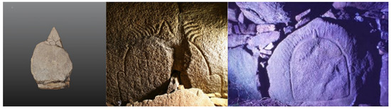 The access corridor includes several successive blocking systems and truncated standing stones aligned with an anthropomorphic stele (Figure 4b), indicating a possible reuse of an earlier megalithic arrangement, similar to observations made at Hoëdic [40]. In the burial chamber, an anthropomorphic stele (Figure 5), two intact pots attributed to the Middle Neolithic II, and a pink bladelet potentially dating to the Mesolithic form an exceptional assemblage.