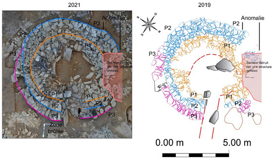 Zenithal view and state of the structures of cairn TRED 9. (Left) Orthophotoplan from the 2021 drone photogrammetry campaign. (Right) Orthophotoplan of the state of structures in 2019. The comparison visualizes the excavation progress and disturbances related to stone extraction.