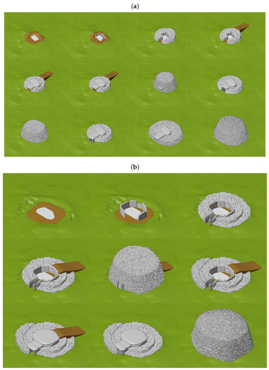 The series of 12 views (Figure 7a) retraces the progression from the reconstruction of the substratum to the final configuration of the tumulus, integrating orthostats, successive facings, and internal blocks.