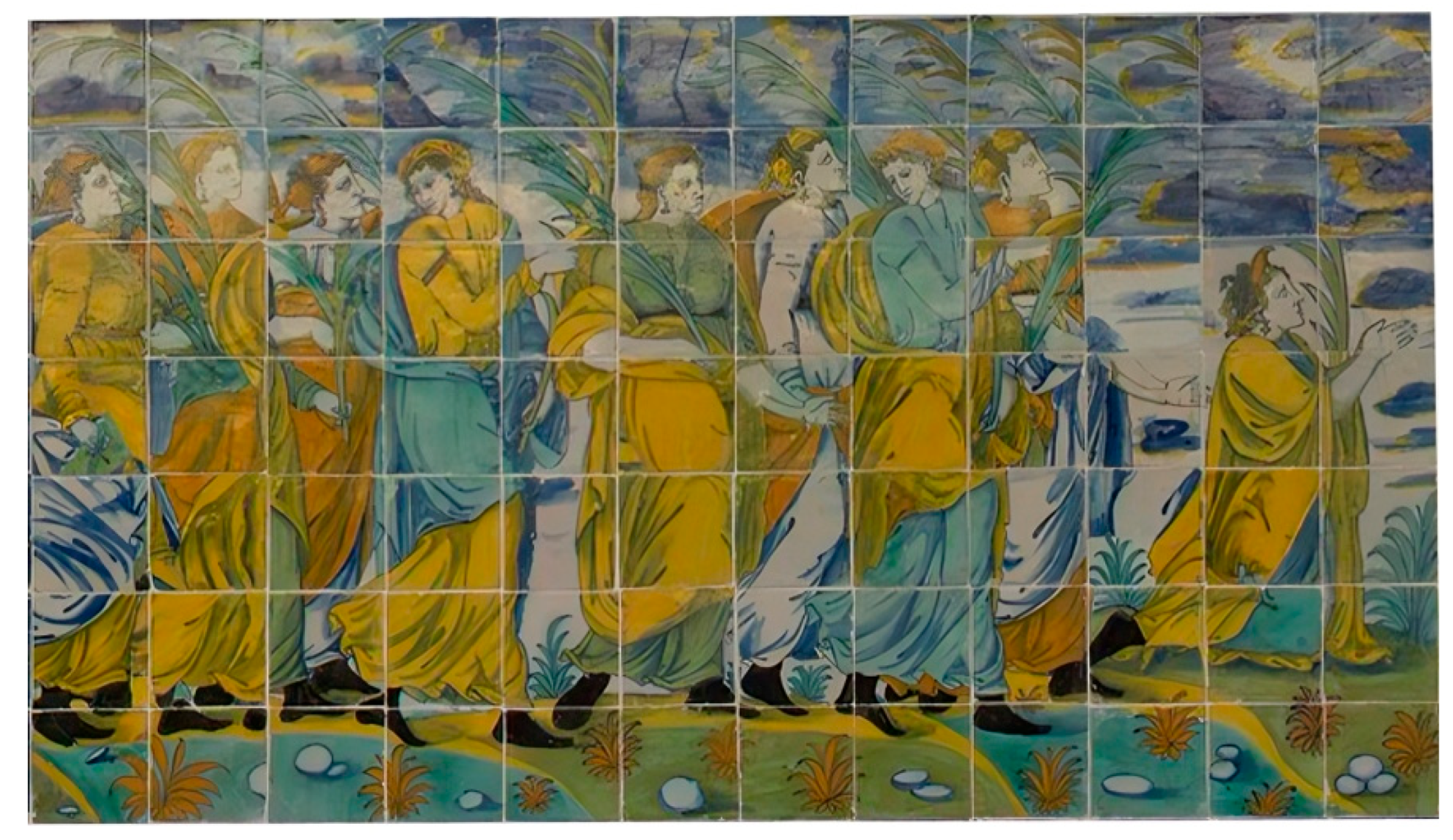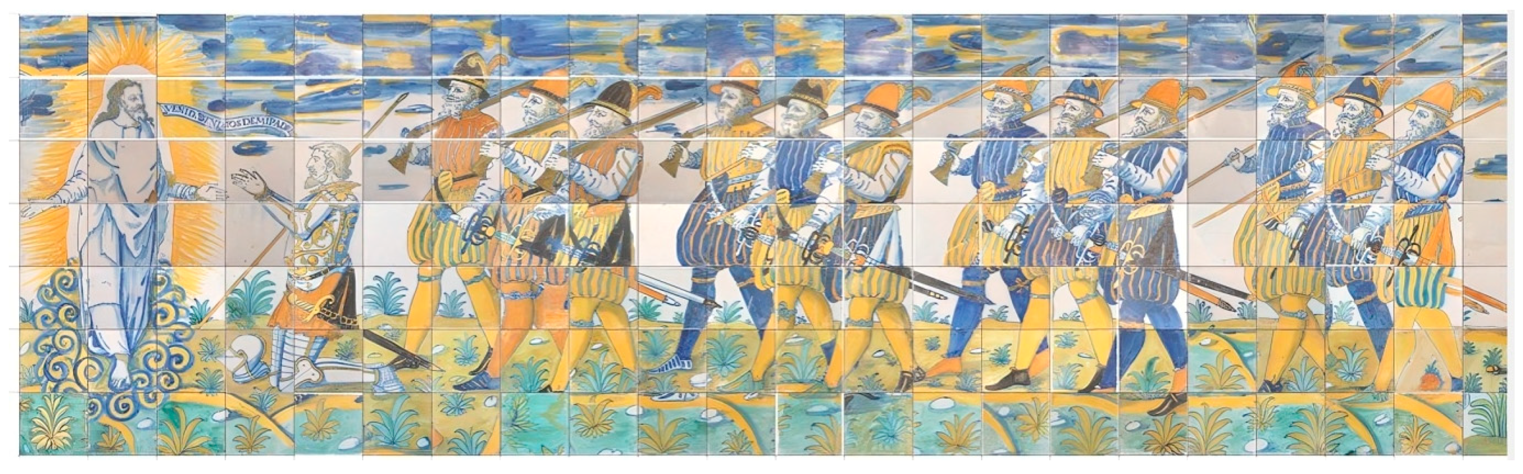 23]. In addition, other original tiles from this procession have been reintegrated into other panels in the Basilica; for example, in the panel of the virgins. If we strictly adhere to the continuity of the design and colour and the logic of the composition, we could obtain a wainscot that would go from 22 columns to 34 columns (204 tiles). However, of those 204 tiles, we can only reliably replace 122, leaving us with 82 missing. This would leave a sequence consisting of Christ, the kneeling soldier with a pike, two groups of three arquebusiers each, the two musicians and the standard-bearer, three groups of three pikemen each, and a final group of three arquebusiers (22 soldiers in total) (