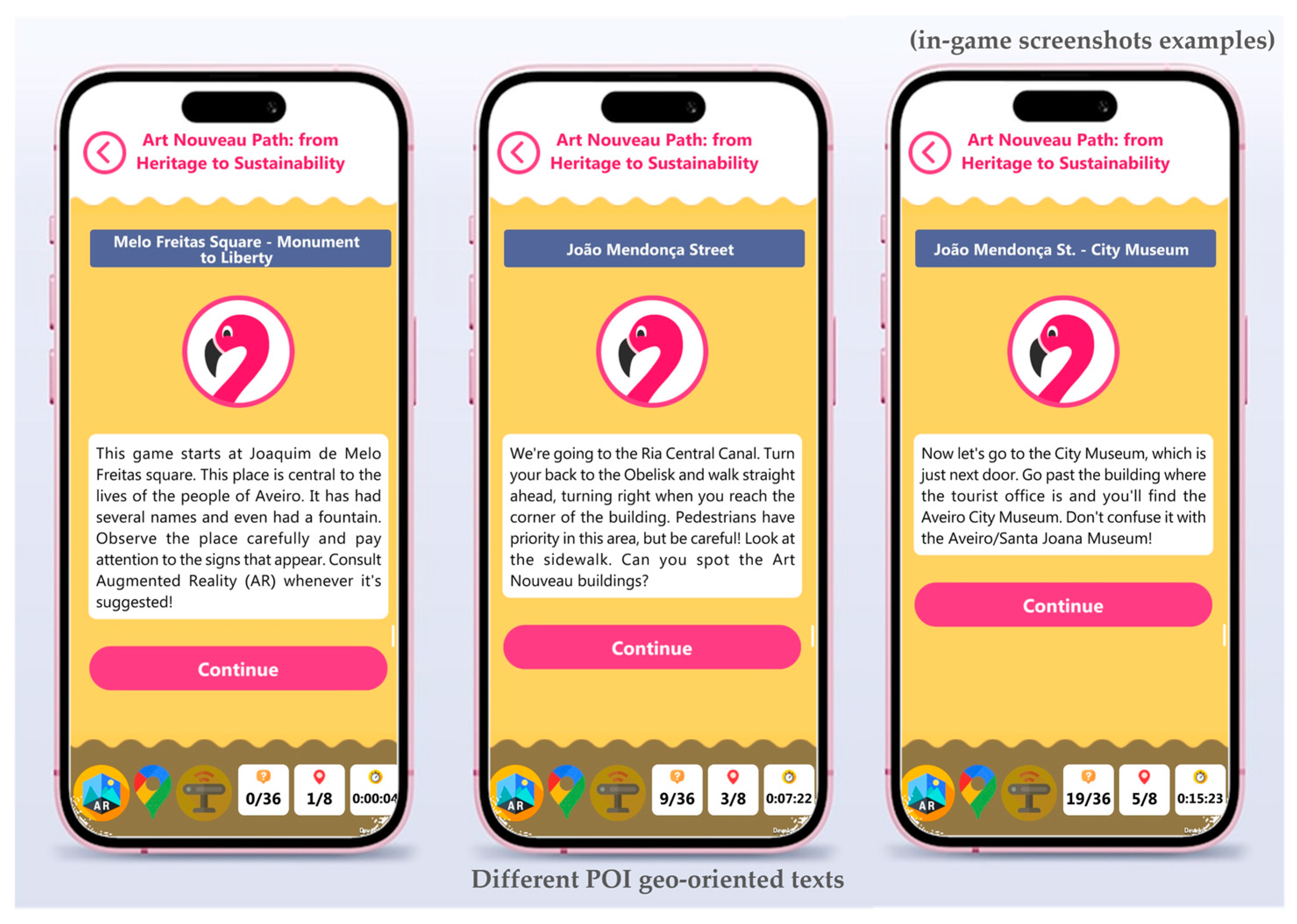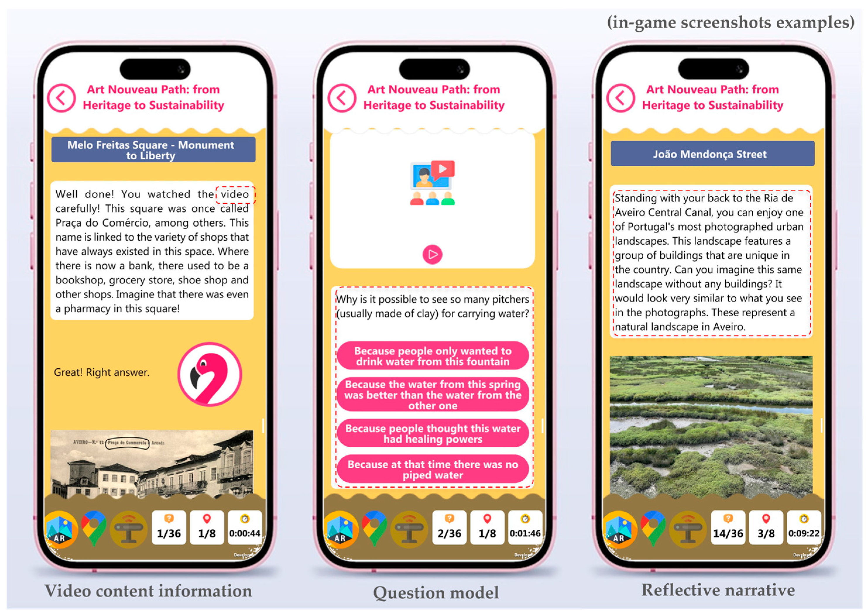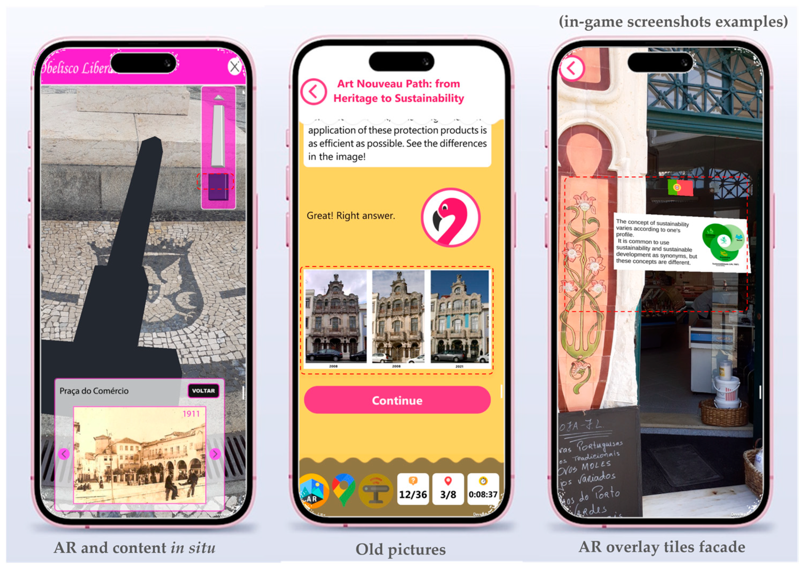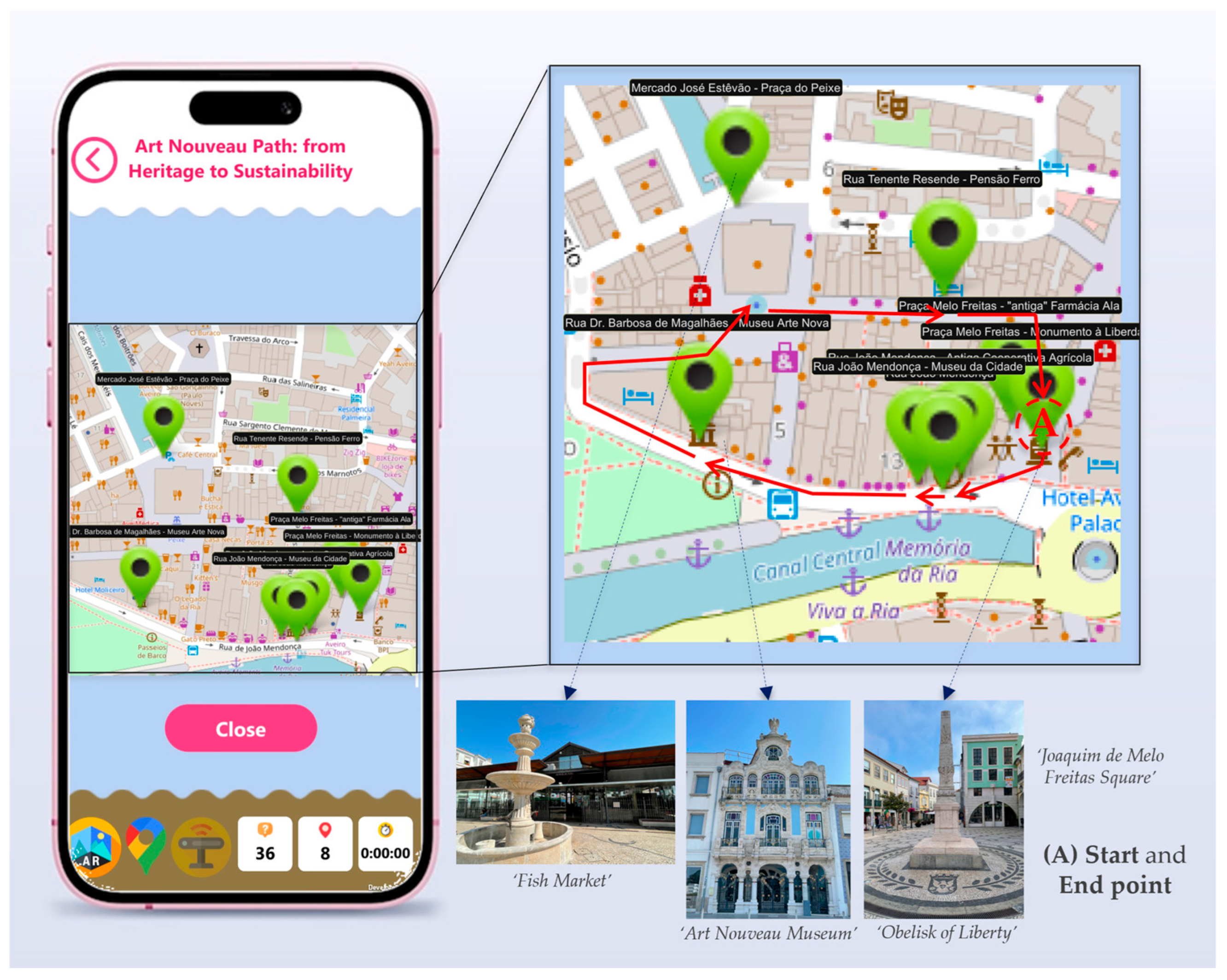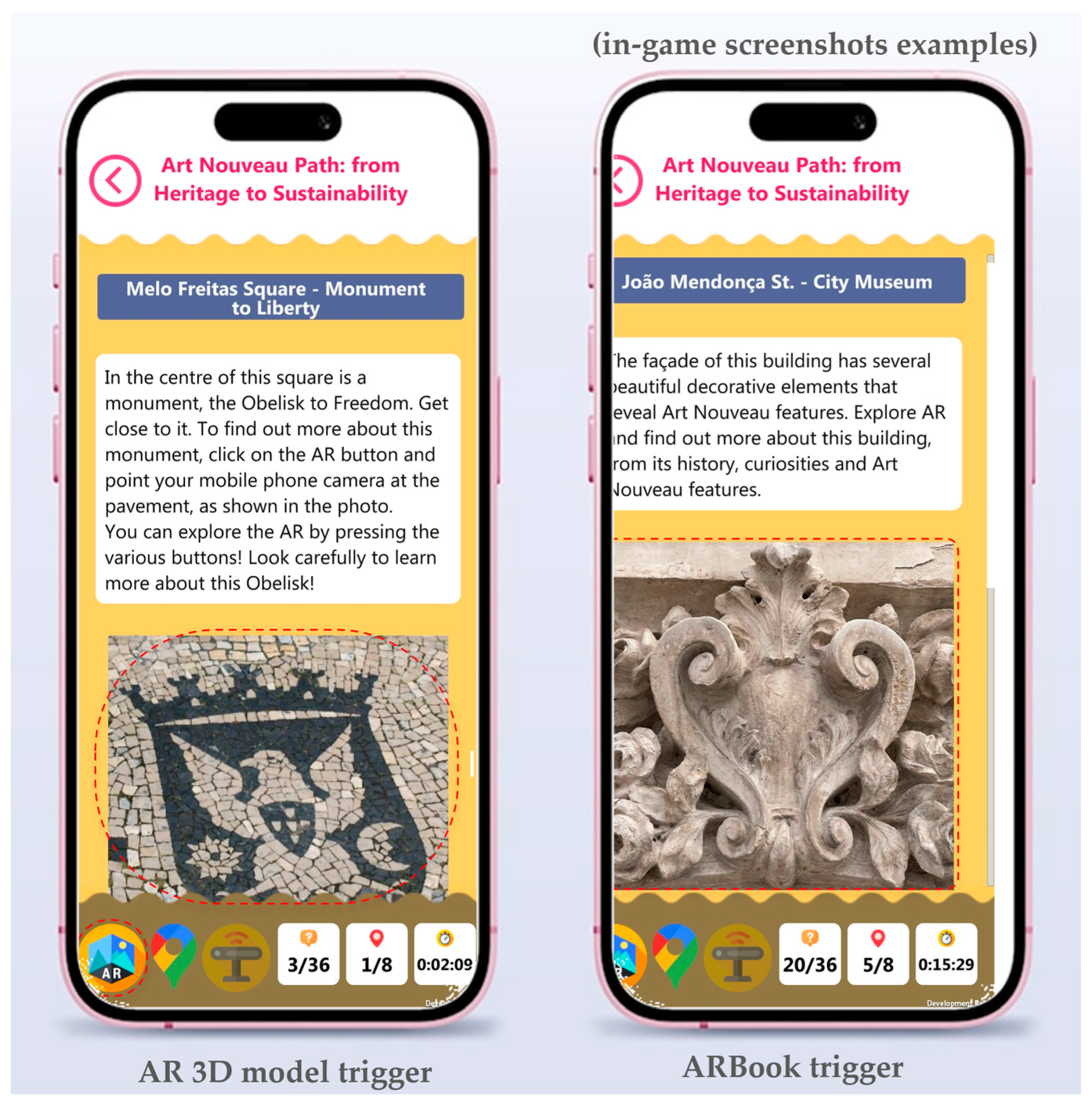 35] to site-specific tasks by combining AR overlays, multimodal media, and narrative dynamics across eight Art Nouveau heritage points of interest (POI) in Aveiro. Implementation activities were organized around collaborative students’ work in small groups (two to three students per group), promoting engagement with both the MARG and in situ built heritage. Students were invited to explore multiple architectural details and connected them, through storytelling, to local history, historical people, and sustainability competence development. During the implementation, students were accompanied by their teachers, who provided structured observations, complementing the gameplay logs and students’ questionnaires.