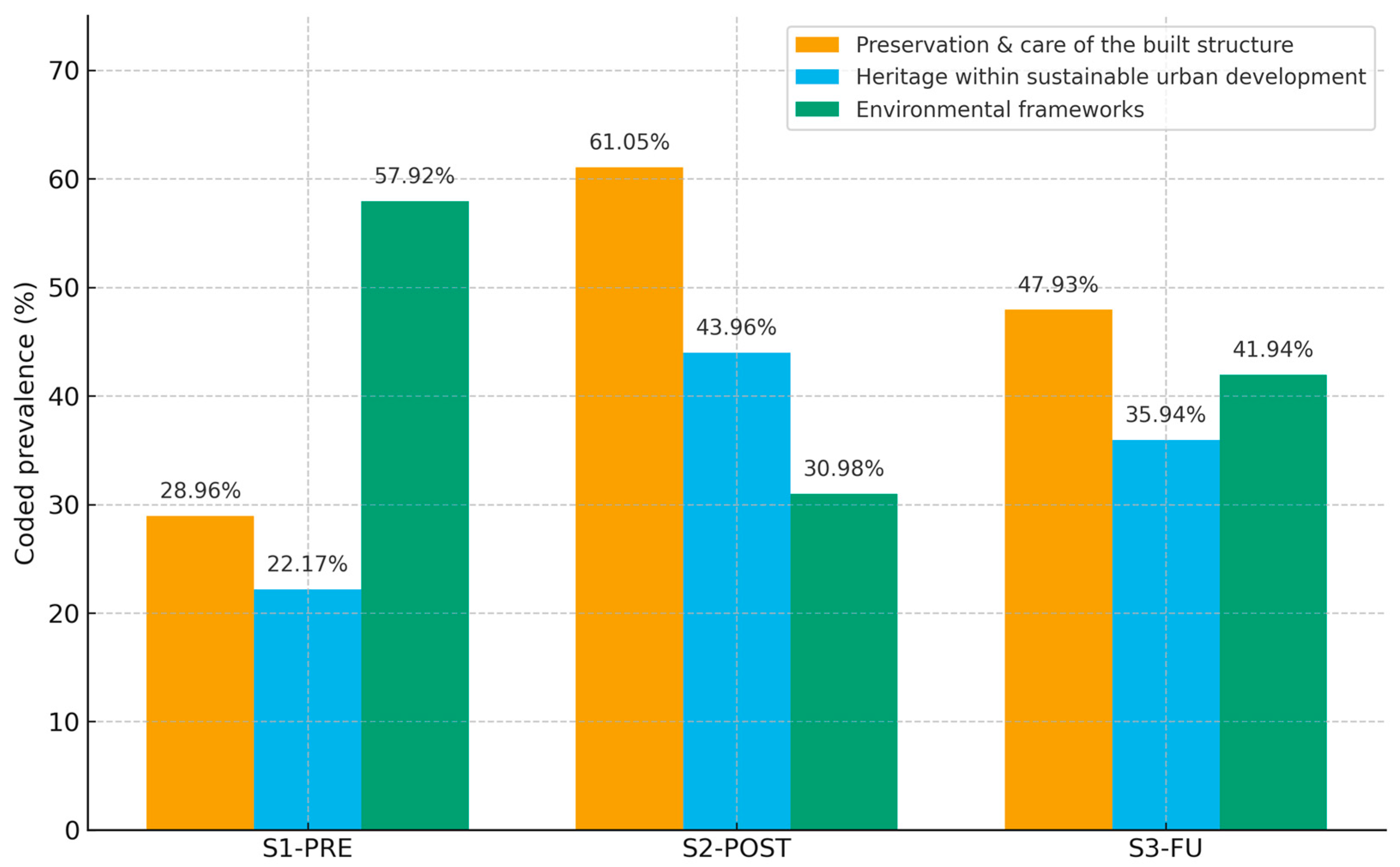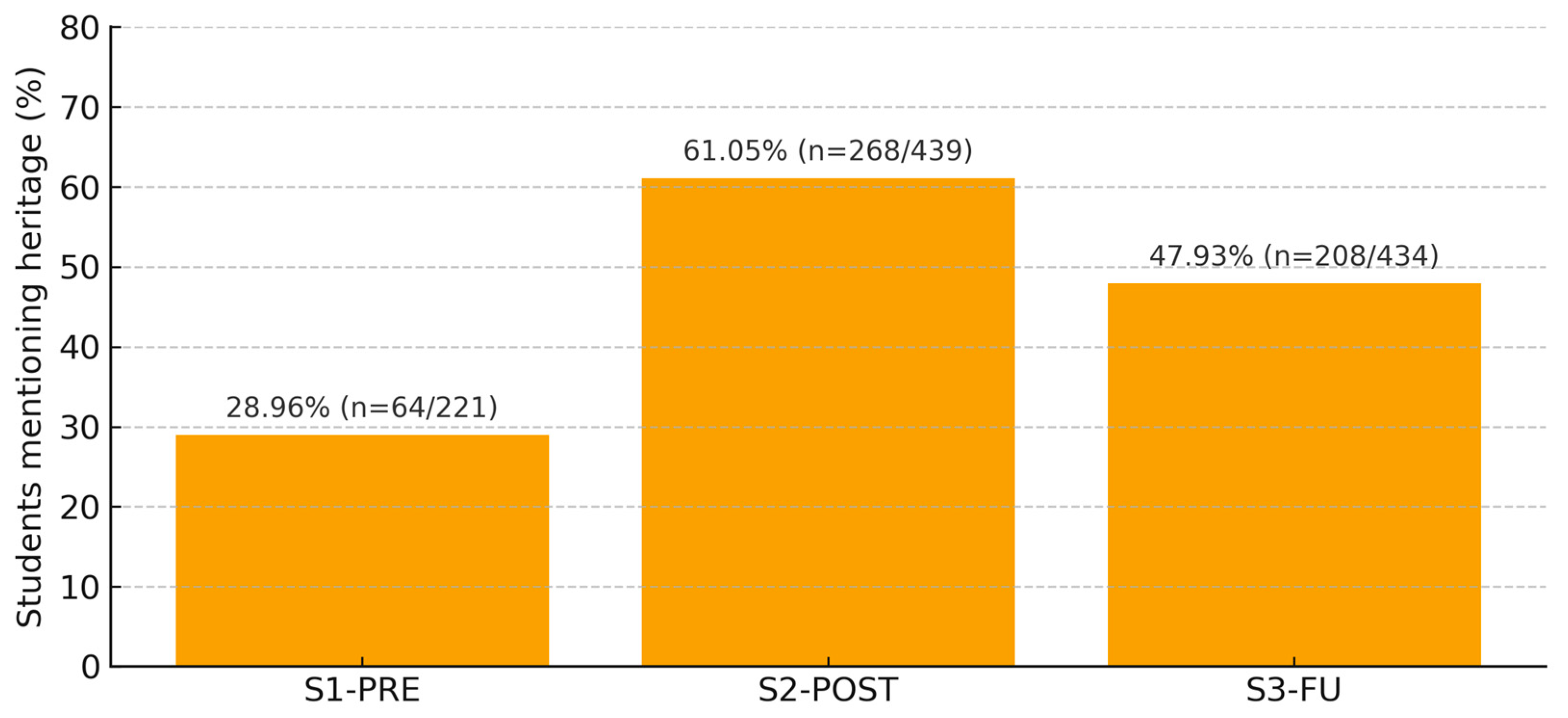At the baseline (S1-PRE, N = 221), only 31.22% (n = 69) of students spontaneously mentioned façades or decorative details when reflecting on sustainability and the city, with most answers centering on natural resources. Following the conclusion of the gameplay phase (S2-POST, N = 439), this proportion increased to 71.98% (n = 316), with frequent mentions of architectural details (41.00%, n = 180), wrought-iron balconies (35.99%, n = 158), and tiles (28.02%, n = 123). In the subsequent study (S3-FU, N = 434), the qualitative coding of open-ended responses revealed that 61.06% (n = 265) explicitly mentioned architectural details (Noticing category), indicating substantial recall of specific features. In contrast, in the closed item A.2.1 [