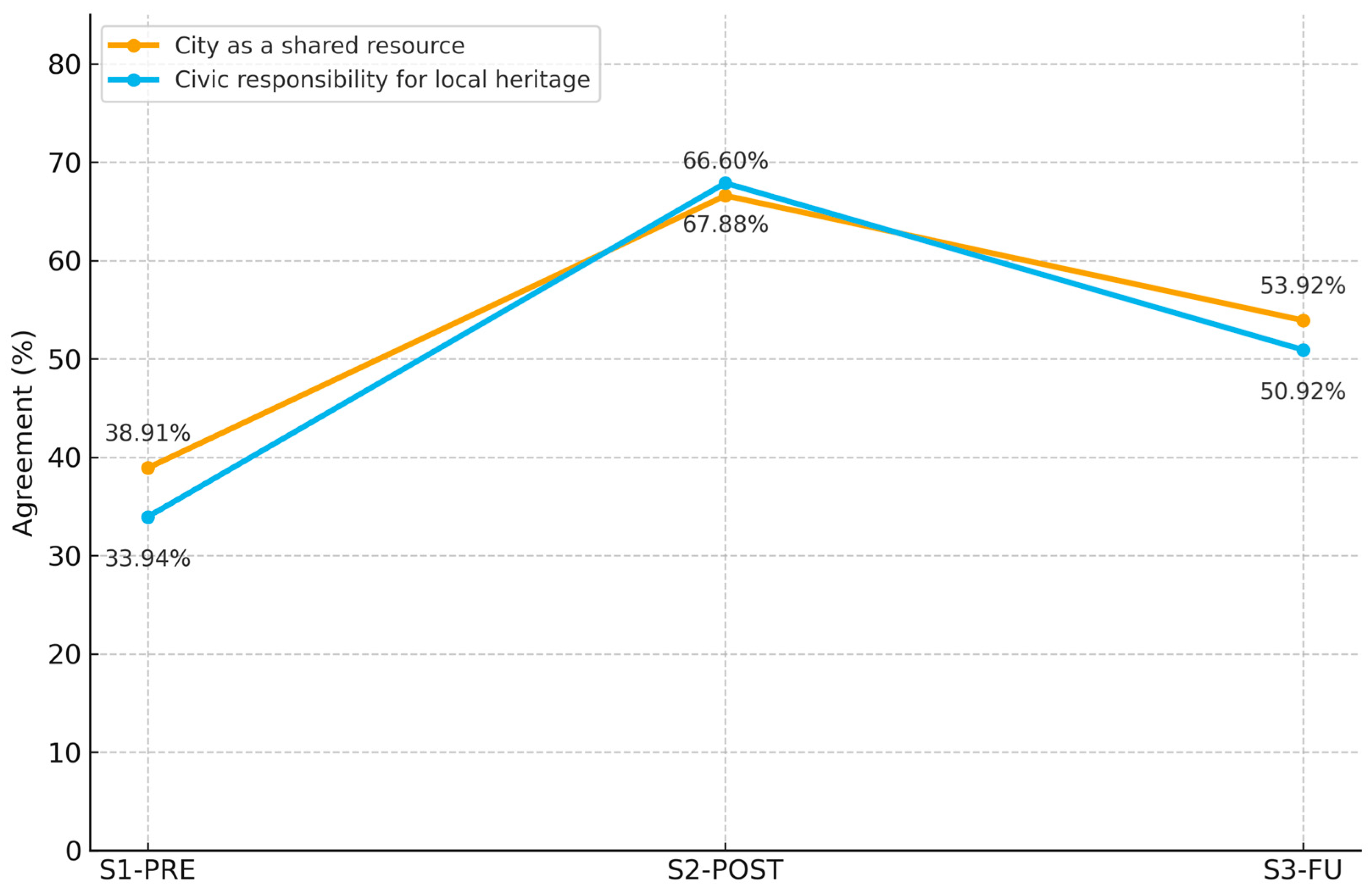 Thirdly, the retention and transfer of knowledge extended beyond the confines of the classroom. In the S3-FU dataset, 69.35% (at question A.1.2.) reported increased sustainability in their actions, 68.20% (at question A.1.3.) shared ideas with colleagues or family members, and 79.03% (at question A.2.1.) demonstrated a closer attention to architectural details. These indicators describe self-perceived behavioral tendencies rather than externally observed civic actions.