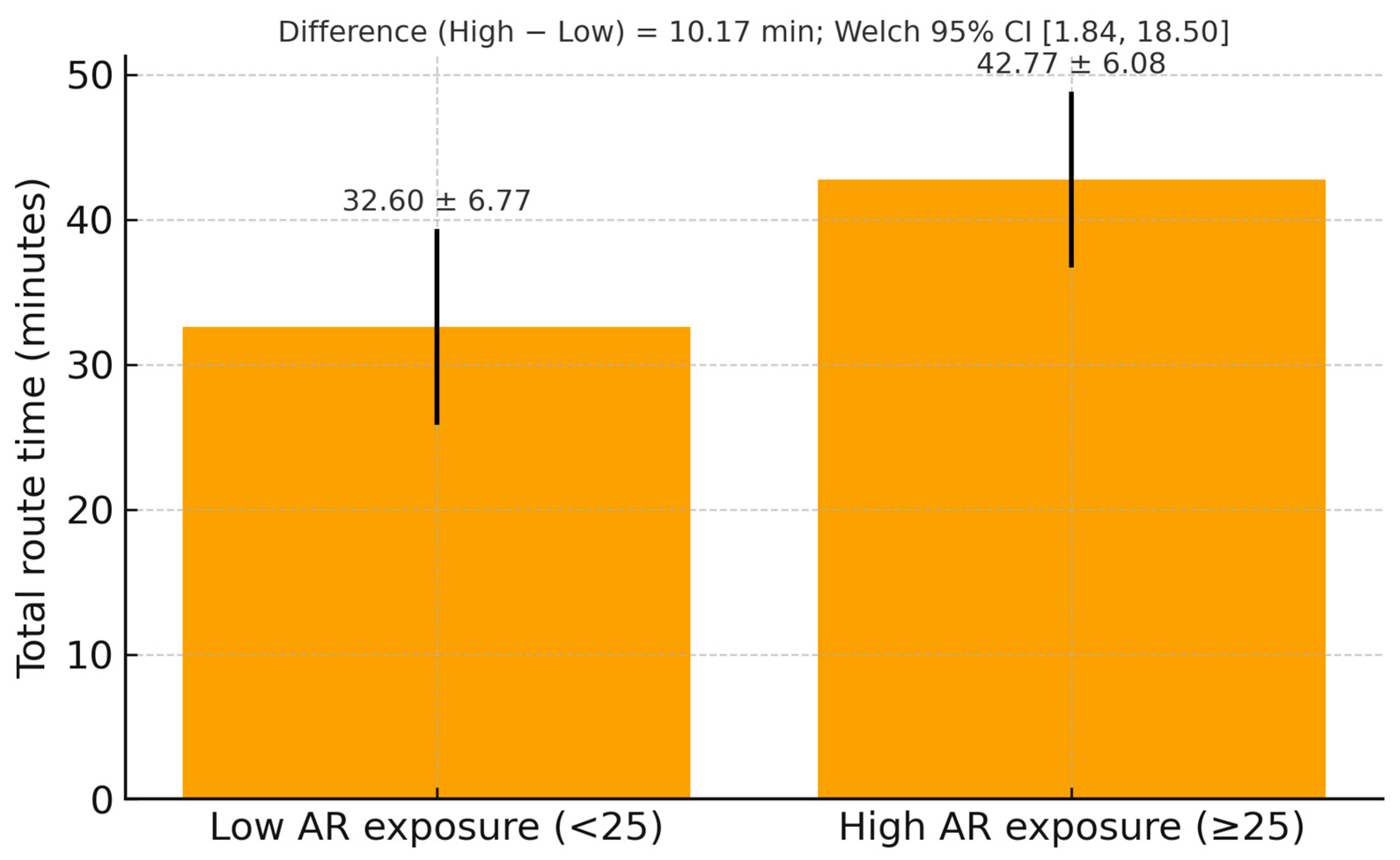 Secondly, the incorporation of multimodality and AR significantly improved user engagement, thereby promoting a constructive challenge. Analysis of the records (N = 118 groups; 4248 responses) revealed 81.00% [95% CI 78.75–83.01%; N items = 11] on AR items versus 73.00% [95% CI 71.39–74.59%; N items = 25] on non-AR items. The mean group-level accuracy in the ‘architectural detail’ subset was 83.00%, indicating a consistently high performance across these items. High AR exposure was associated with a longer route time, with a mean gap of 10.17 min (42.77 vs. 32.60). This association is statistically significant in the OLS specification with session fixed effects and small-sample robust errors (