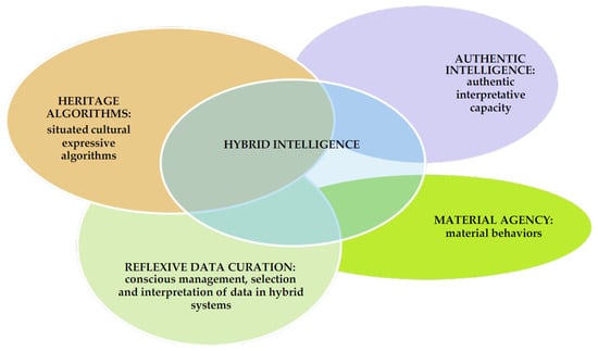 Conceptual map of Hybrid Intelligence. Hybrid Intelligence—co-created between humans and algorithms in craft contexts—is supported by four pillars: Heritage Algorithms (cultural data practices), Authentic Intelligence (human judgment), Material Agency (active materials), and Reflexive Data Curation (critical data management).