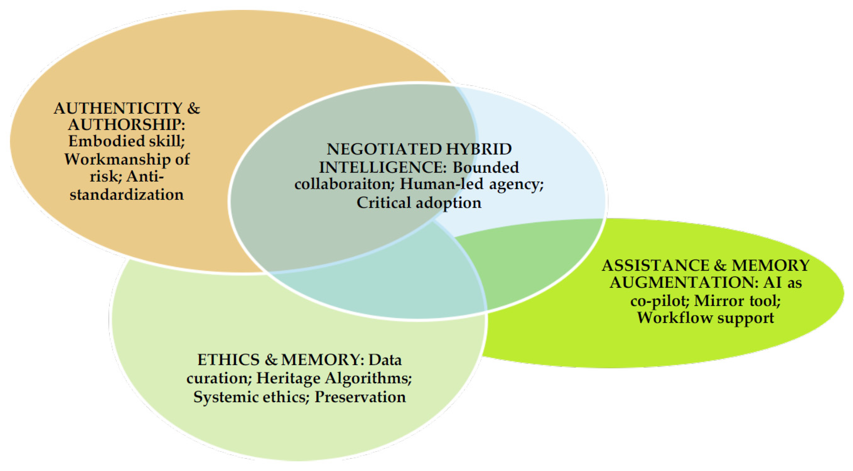 Contemporary artistic traditions further offer critical perspectives for understanding hybrid intelligence. From a post-digital, computational, and craft-based approach, these traditions have long explored the entanglements between humans, tools, and algorithms, demonstrating how creative practices serve as sites of critique, resistance, and experimentation. Integrating these trajectories reinforces the view of AI not only as a technical system but also as a cultural and aesthetic agent embedded within creative ecologies. This perspective aligns with foundational work in heritage studies, where scholars such as Lowenthal and Choay emphasize heritage as a process of interpretation, reinvention, and transmission [17,18]. Understanding AI-driven craft within this lens foregrounds not only technological capability but also the evolving ways in which cultural memory is curated and transformed.