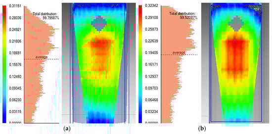 Model deviation on the plane yz: (a) conical configuration; (b) cylindrical configuration. The colors show the calculated gap between the discontinuous but objective model derived from the processing of the 3D point cloud and the continuous but ideal geometric model relating to a cylindrical and a conical configuration with the vertex at the bottom. Red indicates the greatest discrepancy descending from the others according to the known light wavelengths.