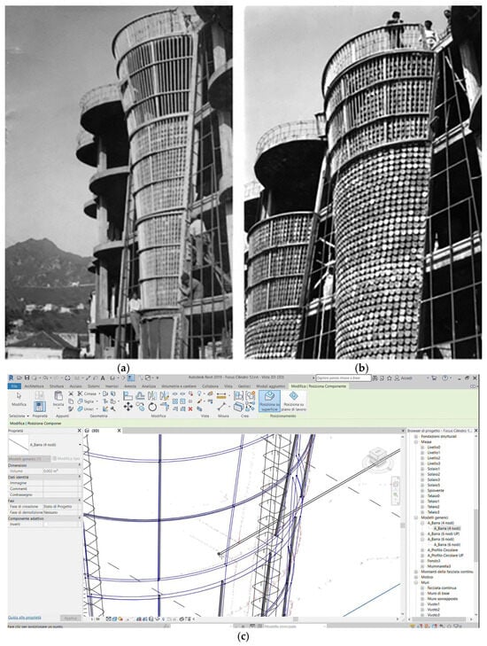 Solimene factory: (a,b) the formwork system used for installing the “mummarelle”, photo by [14]; (c) screenshot of the Revit software. The facade was modelled with the “mass” function structured to imitate the configuration of the formwork.