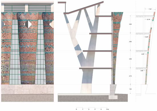 Continuity between the levels is ensured by embedding coloured bowls forged for this purpose on the edge of the reinforced concrete slabs, i.e., bases of terracotta or green glazed amphorae to complete the geometric “Greek” design. The construction by levels justifies the discontinuities measured and recorded with the laser scanner survey (Figure 6). The obvious bottlenecks at the floor levels are the result of necessary adjustments made during construction [10].