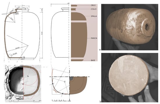 The masonry component was initially linked to a predefined construction technique, a system typology family [18]. The group of elements integrated in the software with common properties and a graphic representation (native system family) referred to the classic perforated clay bricks and, as such, could not be applied to the Vietri mummarelle wall. On the façade, the amphorae, without their bases and detached at eye level, facilitated the non-invasive survey of the exposed south wall. The interior was surveyed using the Structure from Motion (SfM) technique: a series of digital photographs, taken in motion and then processed by dedicated software (Agisoft Metashape Professional version 1.8.2), allowed to derive a reality-based 3D model of the interior. The result of the acquisitions is a numerical model that allows for millimetric precision measurements and meticulous checks on the material and chromatic state of the interior of the vases. The resulting models have been saved in Wavefront 3D Object File format (*.obj) to generate an editable model composed of more or less faceted polygons. A total of 22–29 shots were acquired with a Canon EOS 60D camera, coupled with a 60 mm lens. The camera settings, considering light conditions, were as follows: F-stop F/5.6; ISO 500; and shutter 1/40–1/200. Metric references were used by means of metal scales and targets with no colour reference. The original format (CR.2) was converted to JPEG using Camera Raw version 8.0. The analysis proceeded with the detailed study of the point clouds imported into the working software, with the following steps and related settings. Using horizontally and vertically positioned targets, the resulting models were scaled based on the measurements taken on site and then post-processed to correct them. Using a calliper, the thickness and the diameter of the amphora’s base were then measured on site. Upon inspection, not only visually but also mathematically, the amphora’s body has a quadrangular cross-section. This finding further confirms what was observed when examining one of the original amphorae found in the factory’s warehouse. The amphora is flattened laterally to increase the adhesion surface [19] (Figure 9).