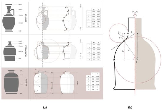 (a) Comparison among terracotta jugs and standard relations applicable at the profile connection points. (b) Focus on matching similar right-angled triangles.