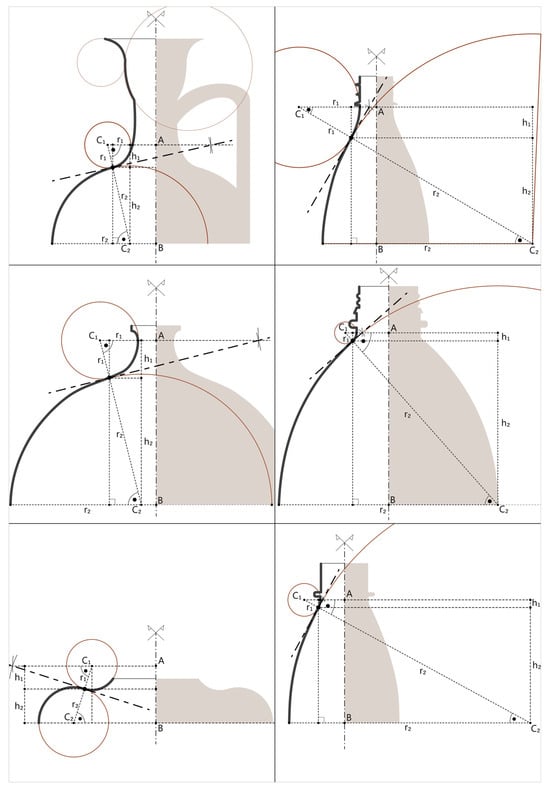 With respect to the stylistic morphological characteristics of the Vietri amphora, a CAD model derived from the survey was used. To identify a specific pattern, a sort of DNA of the Vietri amphora, it seemed useful to start by analyzing the connection between the shoulder and the neck. The neck of the small mummarelle is very narrow and ends with a well-rounded rim. Both features facilitate easy pouring of the liquids contained within. When constructing the wall, the narrow neck allows the inside to be grasped with two fingers to speed up installation, while the rim is used to secure the steel wire that connects them vertically before the concrete is poured. Without losing sight of the original survey, we studied the homothetic relationships between two similar triangles, identified with respect to the axis of the amphora bottle (Figure 11a). Equation f(x) of the tangent line guarantees the continuity of the curve at the point where the two arcs meet. The curve has no cusps at the point of tangency but continues smoothly to the point of contact where the derivative provides its slope [32]. To move from theory to practice, we study standard relations applicable to the profile at the connection points (Figure 11b).