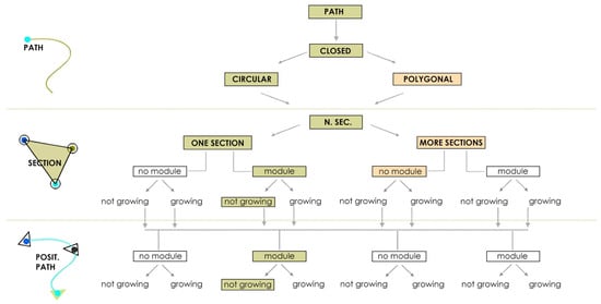 The roles can alternate to achieve a greater articulation of possibilities, further increased by changing the sections along the path, alternatively dragging them onto one or more tracks. A theoretical model is schematized in the figure (Figure 15). The graphic application of extreme modalities is considered indicative of the process (Figure 16). From what has been shown, there is no doubt about the role played by the geometric configuration, starting from the exact transcription of the survey: given the same results, the configuration technique changes the dependent variables, leading to a different strategy for modifying the model.