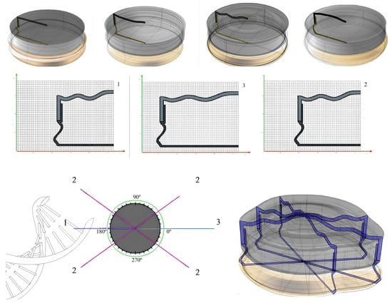 Focusing on some formal aspects of the horizontal sections, it becomes clear that the circular bases on the façade could be automatically modified. A latent, progressively articulated geometry (Figure 14) is reflected in the complexity of a circumstantial paradigm that, starting from a circle inscribed or circumscribed at the base of the amphora, defines a loop constrained by the starting point coinciding with the end point. A grid guides applications to the opaque body facade choice of the module, a concrete part of the object to operate based on multiples and submultiples. To suggest the transcription of criteria into space, an initial cycle of choices can be identified in the relationships established between guiding lines and generating lines.