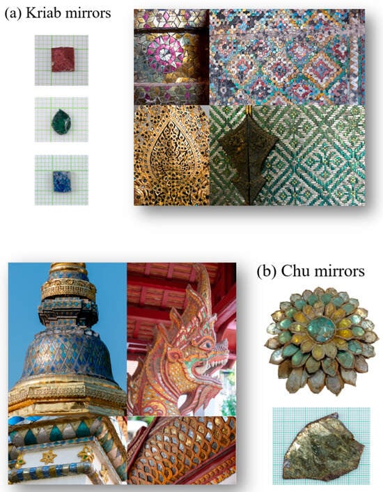 Examples of Kriab and Chu mirrors and their use in archeological artifacts from various regions of Thailand: (a) Kriab mirrors arranged in tessellated decorative patterns, photographed in museum and exhibition collections in central Thailand; and (b) thin, flexible Chu mirrors used for curved inlay work, photographed in temples and museums in northern Thailand. Mirror fragments that had detached from the artifacts were collected with permission from the respective site owners. All photographs by Pengpat, K.