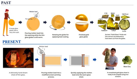 As previously mentioned, the old book Tumra Hung Krachok [18] does not provide details about the glass-blowing or lead-coating techniques required to replicate the production process. Historically, such knowledge was often kept as a family secret. Unfortunately, since the prince did not pass this knowledge on to successors, it was inevitably lost. However, Kock and Sode (2002) [11] reported a lead-coating technique used on large glass globes in Kapadvanj, Gujarat. These Western Indian glassworks are believed to have been made during the Mughal period, approximately 500 years ago. Based on Thailand’s long-standing connections with India and historical accounts describing possible glass production during the early Rattanakosin period, glass blowing was selected as a representative ancient glassmaking technique, while acknowledging that direct archeological evidence remains limited. Figure 4 (Past) illustrates the proposed schematic representation of how ancient glass workers crafted the ancient Thai mirrors.